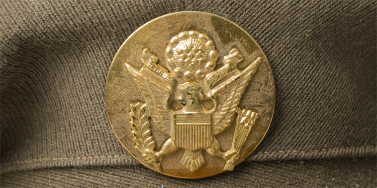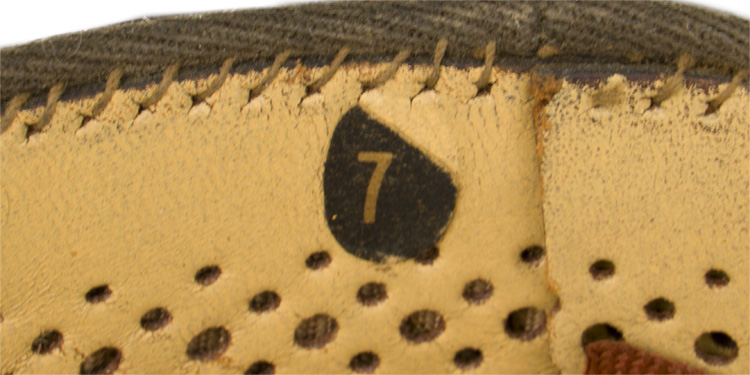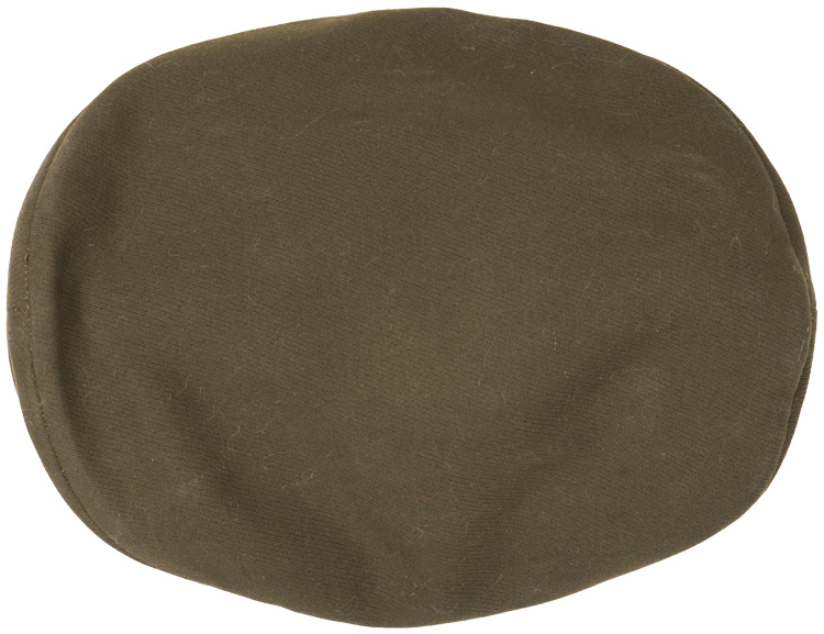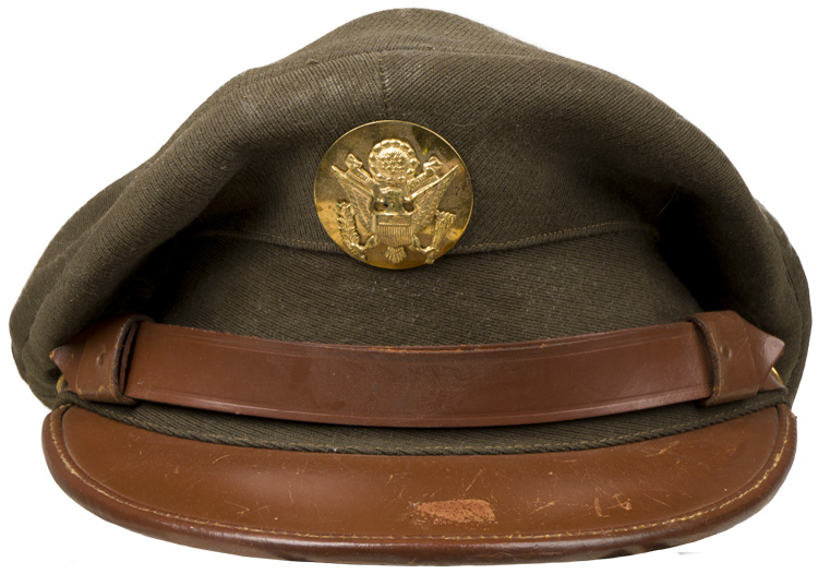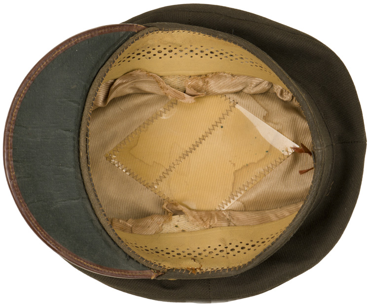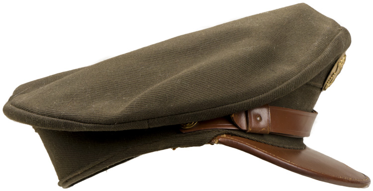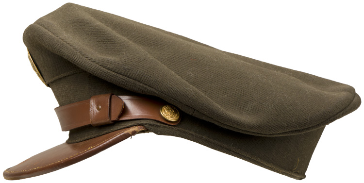 Olive drab wool top and centerband and leather visor. Enlisted cap badge is is die-struck alloy with a fire gilt finish. Badge takes the form of an American Eagle with stars and stripes on the shield that resides on the eagles chest. The eagles right claw holds laurel, while in the left claw, he holds a bundle of arrows. The scroll which is spread on the wings, has the United States Motto of, "E pluribus Unum." Which is Latin for, "Out of many, one." This is a direct reference to the thirteen colonies that are united as one nation. This motto was suggested by the first great sea committee in 1776. Above the scroll, there is a round cloud with 13 stars in the middle. Again it alludes to the union. Nice original chinstrap is complete with both brass buttons as well as the backstrap. The brass buttons also have the inscription of the United States coat of arms. Havana brown leather visor. Gold colored silk or rayon liner is complete, but with some tearing to the seam under the sweatband. A tag indicates the cap is a size "7." Stiffening wire has been removed. Shows typical age and usage.