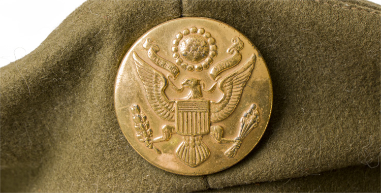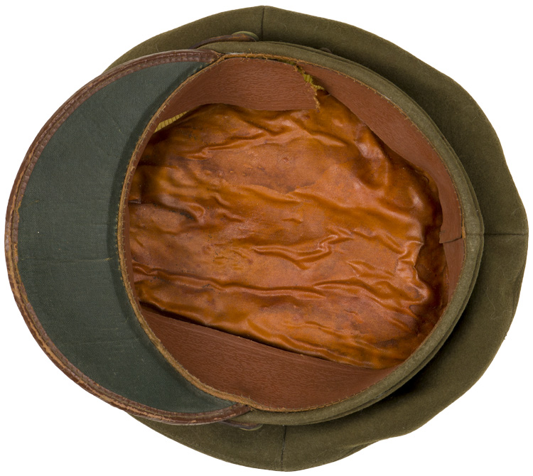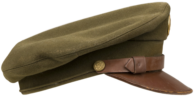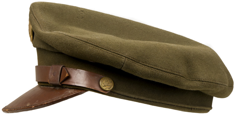 Olive drab wool top and centerband and leather visor. Enlisted cap badge is is die-struck alloy with a fire gilt finish. Badge takes the form of an American Eagle with stars and stripes on the shield that resides on the eagles chest. The eagles right claw holds laurel, while in the left claw, he holds a bundle of arrows. The scroll which is spread on the wings, has the United States Motto of, "E pluribus Unum." Which is Latin for, "Out of many, one." This is a direct reference to the thirteen colonies that are united as one nation. This motto was suggested by the first great sea committee in 1776. Above the scroll, there is a round cloud with 13 stars in the middle. Again it alludes to the union. Nice original chinstrap is complete with both brass buttons as well as the backstrap. The brass buttons also have the inscription of the United States coat of arms. Havana brown leather visor. Liner is complete. Sweatband has a vertical tear, but otherwise the cap shows typical wear and usage.