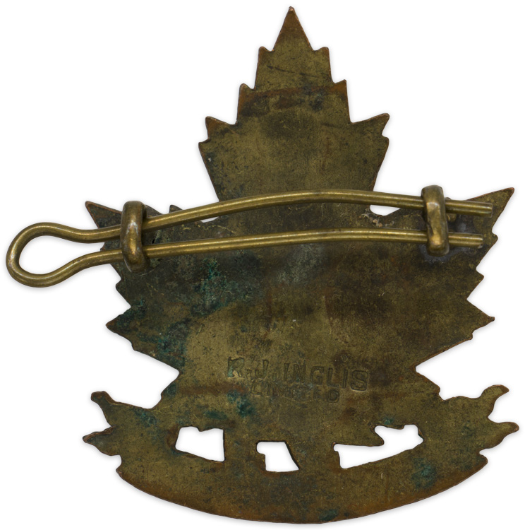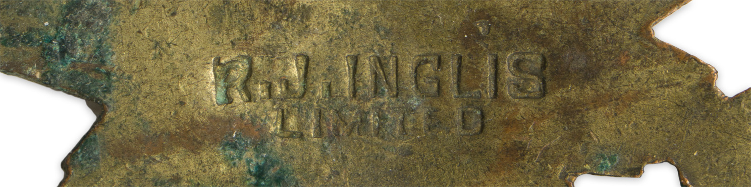 A 35mm x 43mm formed pickled copper badge with a pair of lugs and cotter pin to the reverse. Marked "R. J. Inglis Limited".