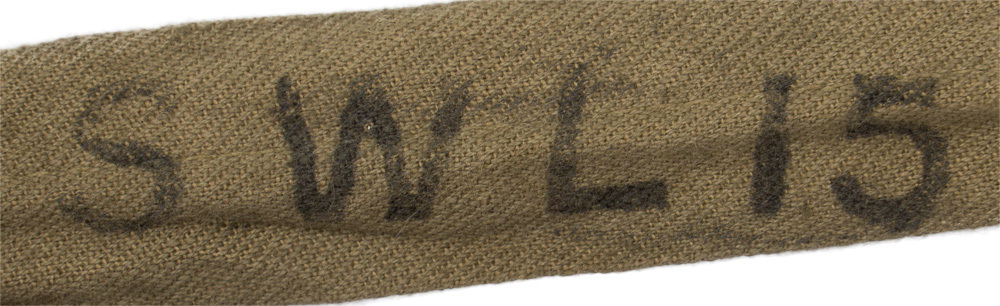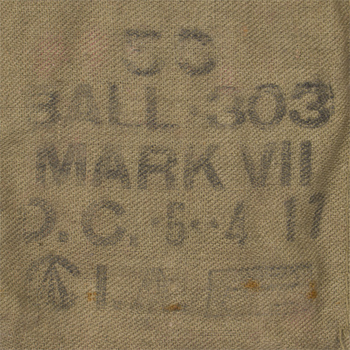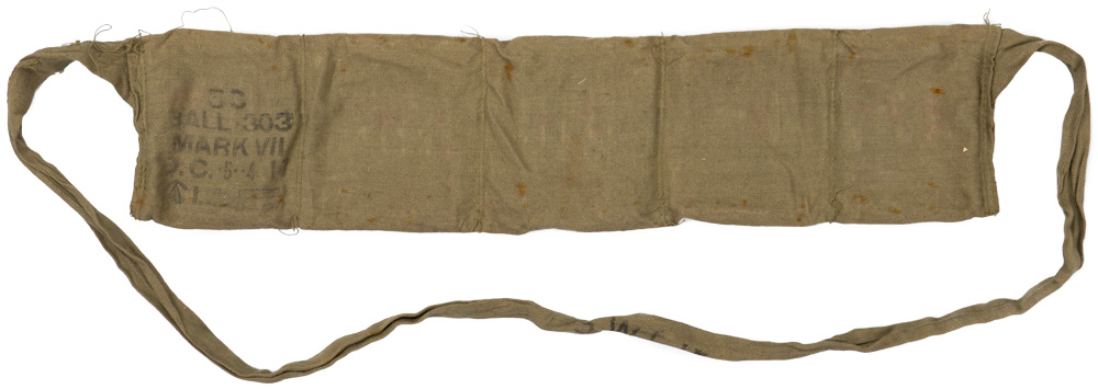 Five pocket cloth bandolier with carry strap to contain 50 rounds of 303 British Ammunition on stripper clips. Canadian C Broadarrow marked. 1917 dated.