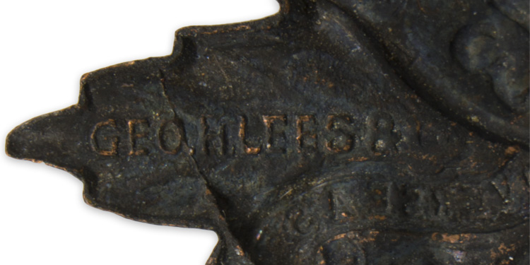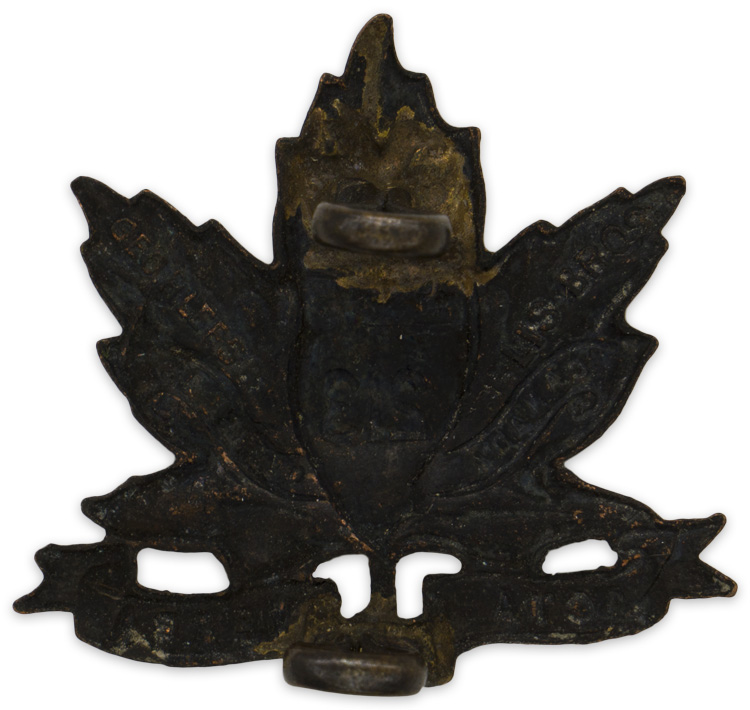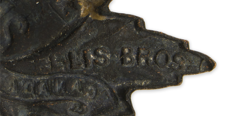 A 3cm x 2.5cm maple leaf formed badge whose front shows the Arms of the Family of Washington with "Canada Overseas" and "Acta Non Verba" to banners. A pair of lugs are to the reverse, as well as the manufacture name "Elis Bros."