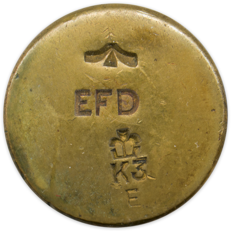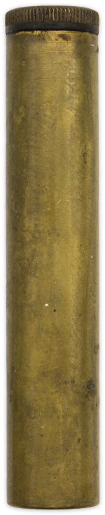 The standard issue riffle of the Canadian/British Army was the Lee-Enfield No 4 Mk I Rifle. It was a bolt action, manual repetition, .303 cal , single fire rifle, that could be equipped with a bayonet for hand combat and a scope for sharp shooting.PHYSICAL DESCRIPTION: Roughly 9.5cm tall, 157mm diameter, cylindrical, brass metal construction, oiler dispenser for the Lee-Enfield No 4 Mk I Rifle. The dispenser has a diamond knurled screw off top with leather washer intact. The top has a steel metal "spoon" soldered to the bottom that fits down the center of the dispenser when screw cap is applied. The cap screws into a threaded insert that has been soldered in the cylinder. The bottom of the cylinder is sealed with a soldered brass plug. The top has been stamped with a "broad arrow", "EFD" and "K3" surmounted by a Kings Crown. Some oil is present in the oiler.