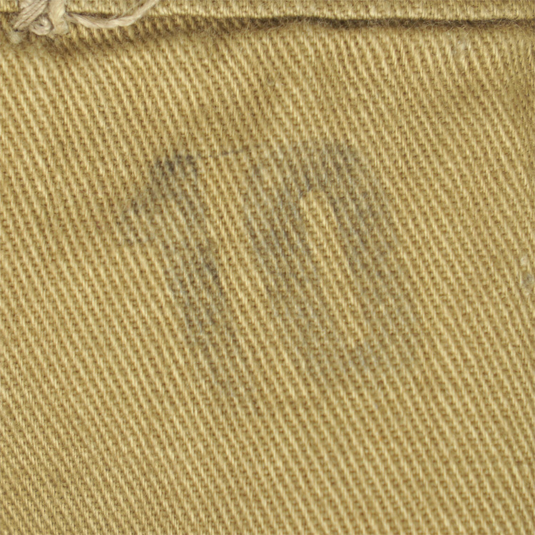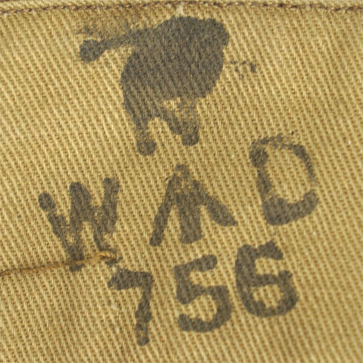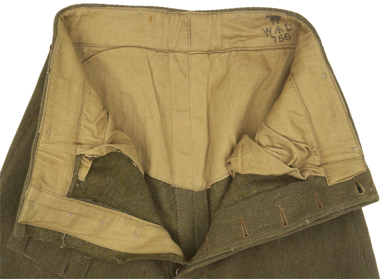Nice quality khaki construction motor-cyclist breeches with dual-ply fabric reinforcement panels to the inner thighs. The breeches feature a vertical, five button, French fly. The breeches have two, diagonally angled, slash front pockets and a single large exterior pocket to the right leg. The waist is lined in brown cotton with the pocket bags being constructed from the same material. All the suspender buttons are attached and show original stitching. Dual button adjustable cuffs to each leg end. The breeches are "WD" marked. The waist measures approximately 30" with a 27" inseam.