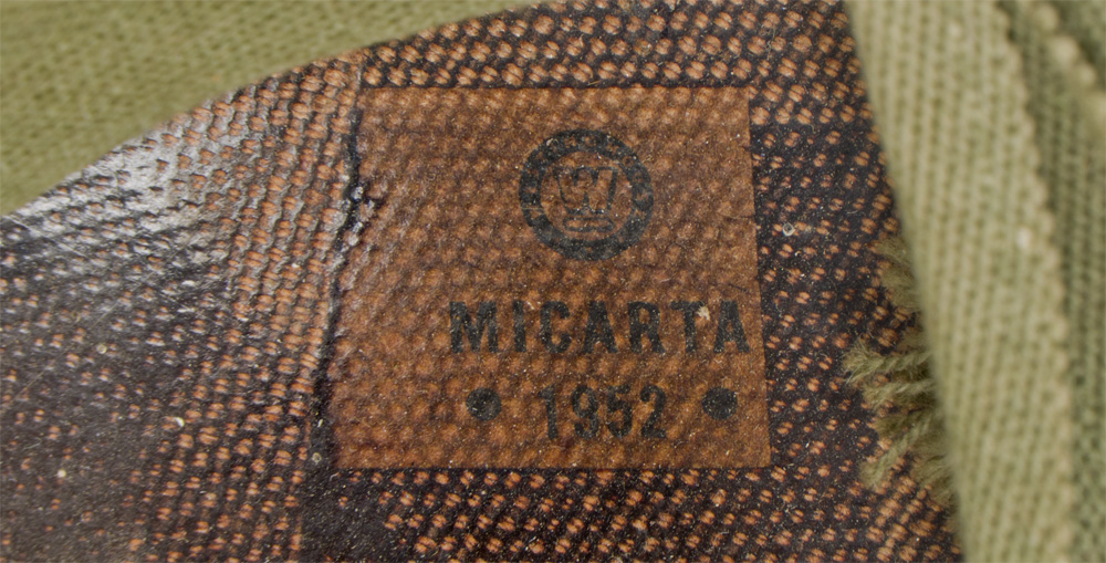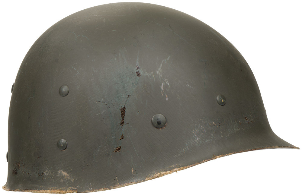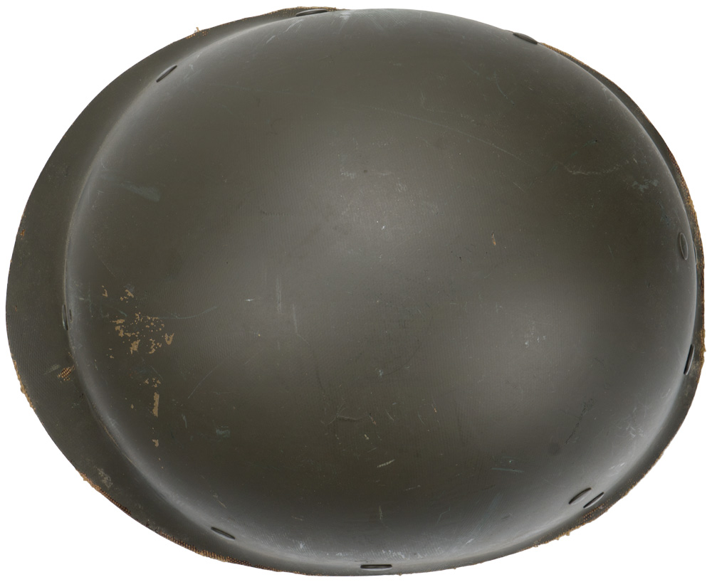 BACKGROUND: The M 1 helmet was developed as a replacement for the M 1917 helmet that had seen use since WW1. It was designed by using the crown of the M 1917, removing the brim and adding extensions to protect the neck, ears, and forehead. The resulting form was then used as a template for the production of a helmet body from a single piece of Hadfield Manganese Steel. The liner and suspension were developed after a modified Riddel Football helmet. The M 1 helmet was approved for production in June of 1941. Early models had solid loops (fixed bale) for the chin straps but they broke off to often and were replaced with a moveable hinged loop. The original rim of the helmet was made of stainless steel but it was found that the paint that was used would wear off to easily and leave a shiny reflective surface. To remedy this they switched to a Hadfield Manganese Steel and also changed the butt of the rim from the front to the rear of the helmet body. This change took place in October of 1944. The M 1 helmet had the best ballistic characteristics of any helmet developed up to then and could with stand the force from a 230 grain, .45 caliber bullet with a velocity of 800 feet per second.
