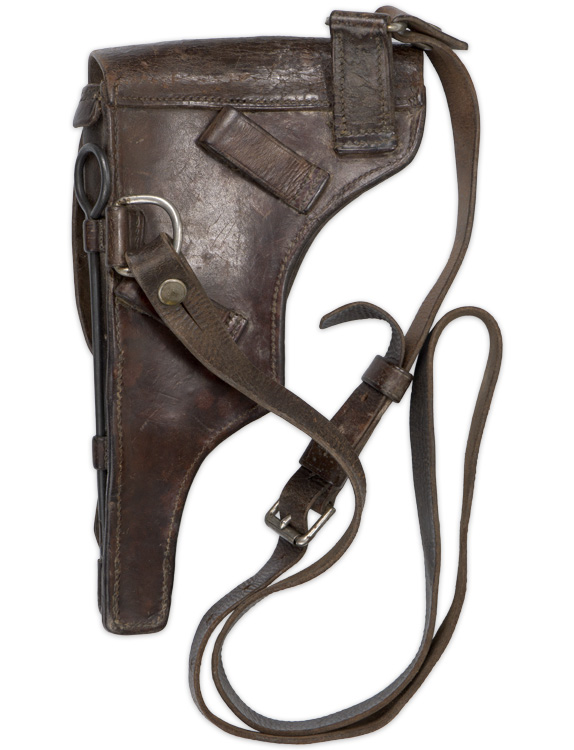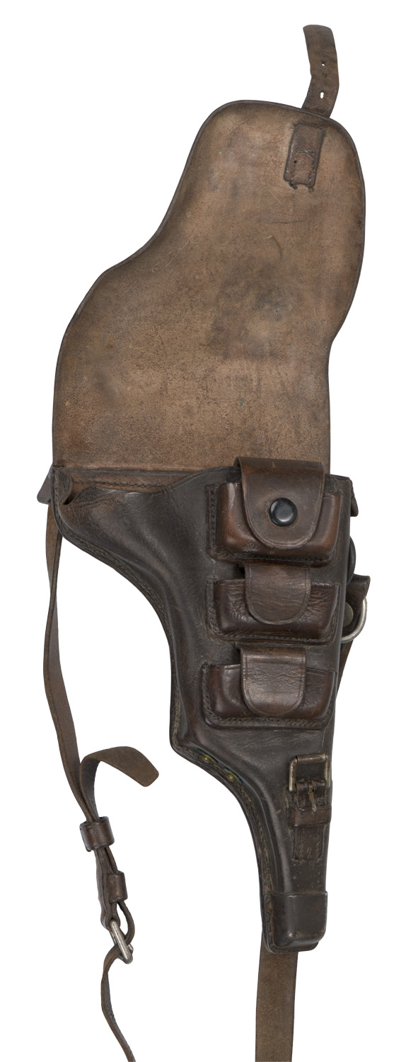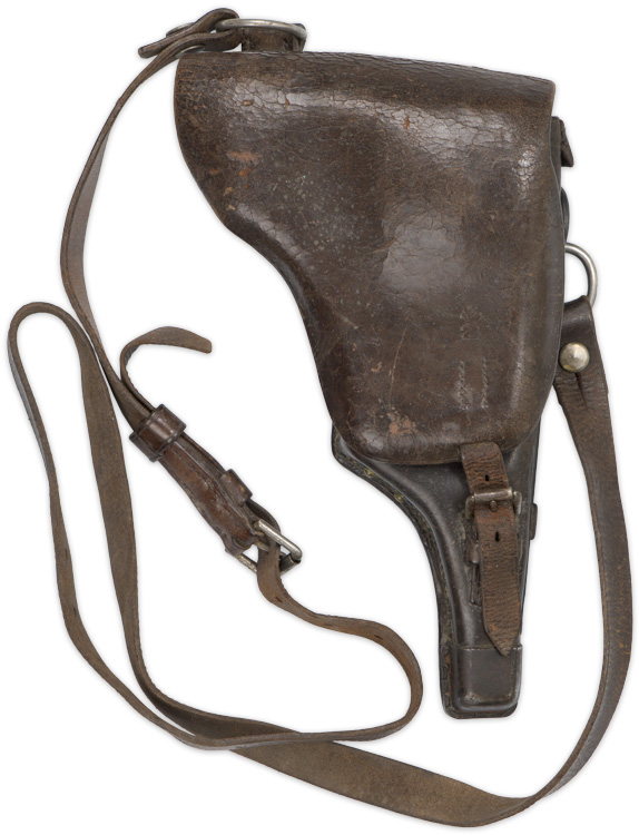 Danish Bergmann Holtser also used by the Schalburg corps. Brown leather construction. Complete with original shoulder strap and cleaning rod. Marked with a “Crown over 22".