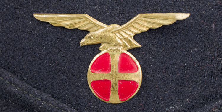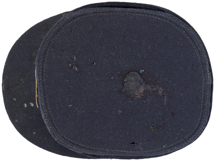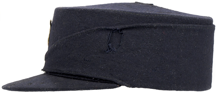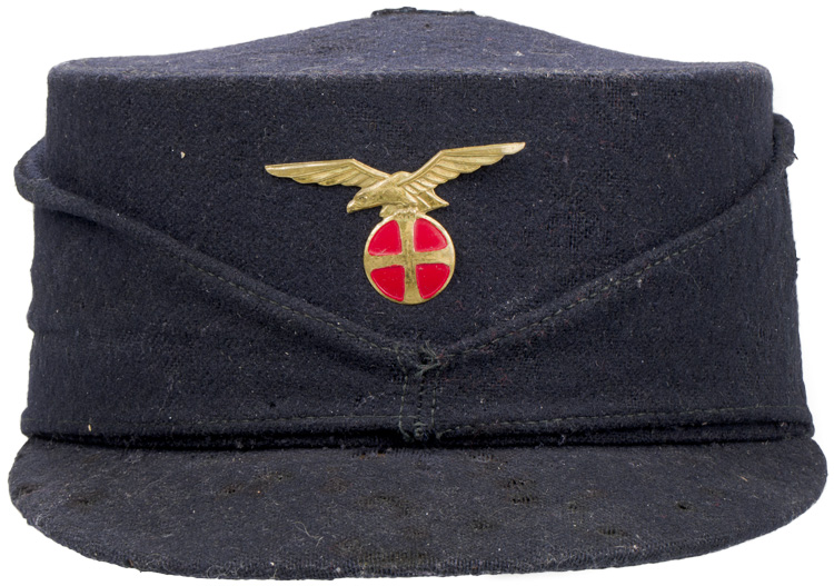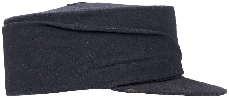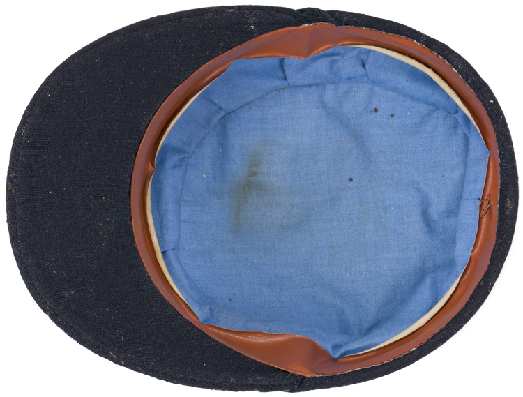 PHYSICAL DESCRIPTION: A very dark navy blue, wool construction cap with a die struck, tombac, badge with a stylized eagle with outstretched wings clutching a red painted sun cross in its talons. The cap has a blackened ersatz oilcloth chin strap, with two adjustment sliders in the same material, secured at either end by small, blackened buttons. Beneath the chinstrap extends a stiffened visor. The interior of the cap is fully lined in light blue cotton with a tan alkor sweatband. There is a moth hole repair to the top of the cap and a section of missing wool to the right side. The cap is approximately a size 54.