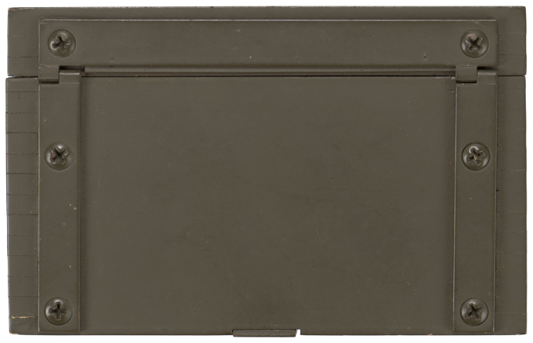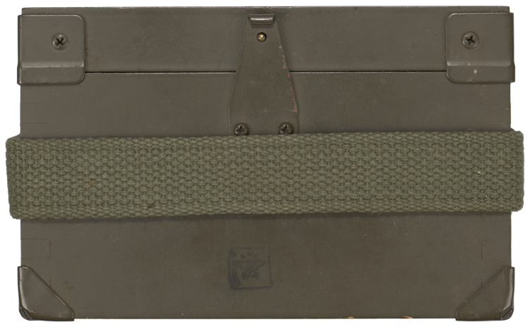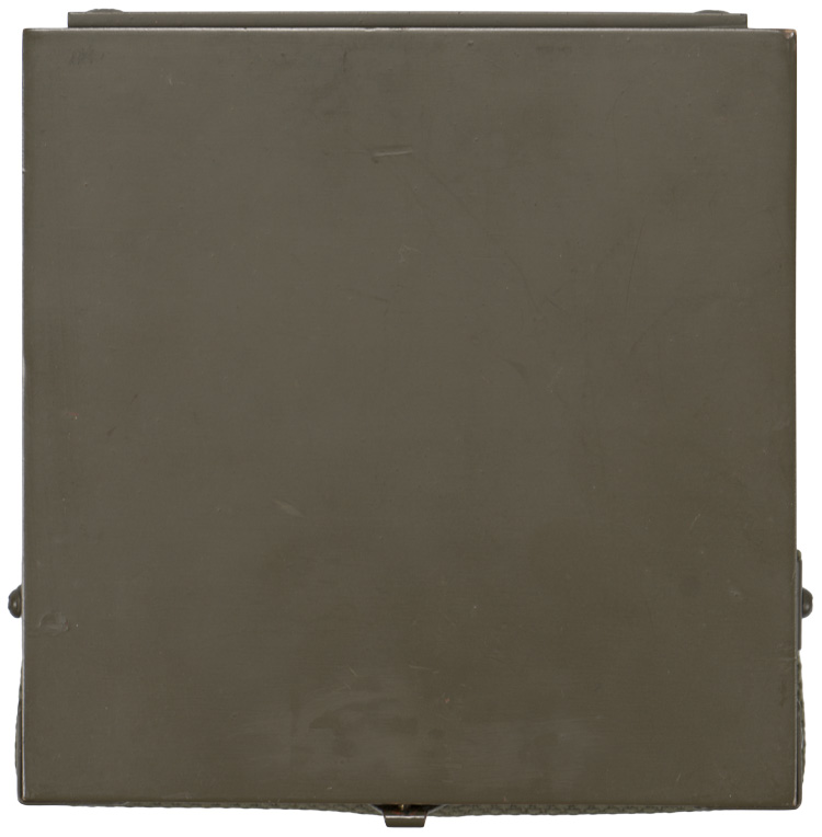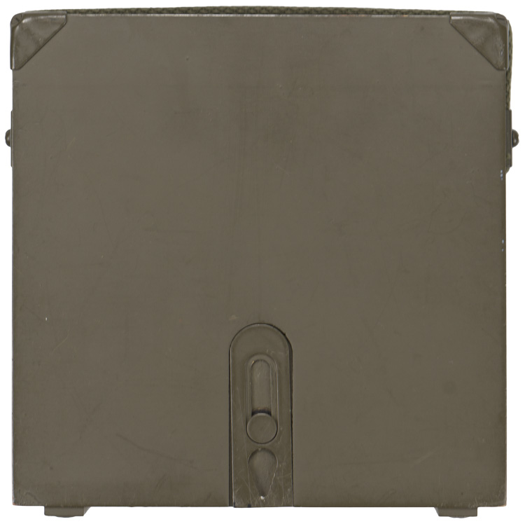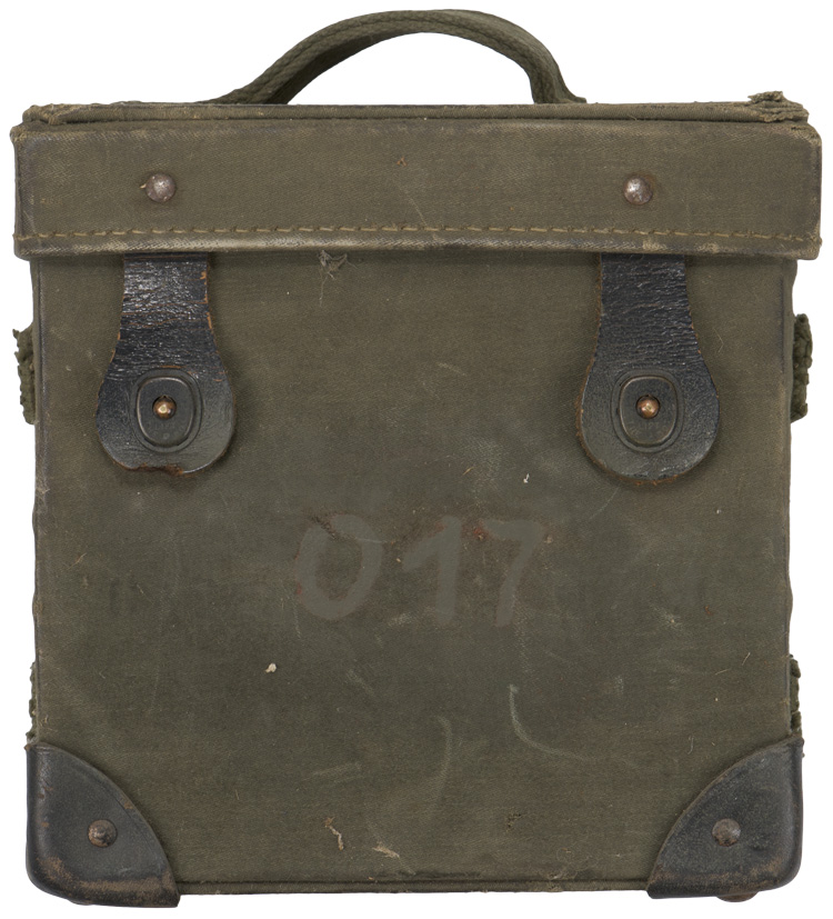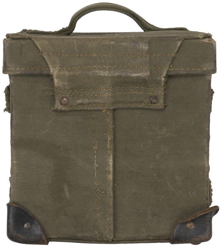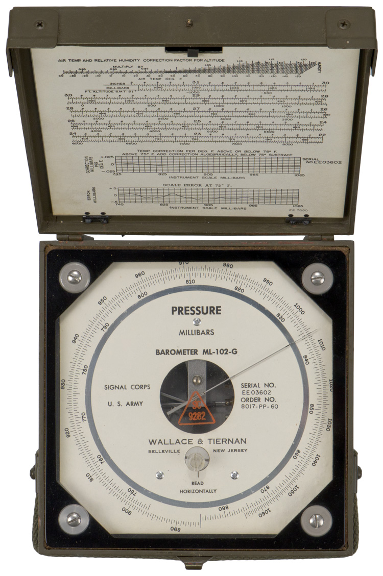 A rigid, olive drab webbed case with green velvet lining that houses the ML-102-G aneroid barometer that is manufactured by Wallace & Tiernan of Belleville, New Jersey. The barometer measures approximately 10cm x 16cm x 16cm with webbed handle, while the case measures approximately 14cm x 21.5cm x 22cm with webbed carrying handle and lift the dot snaps to the front panel.