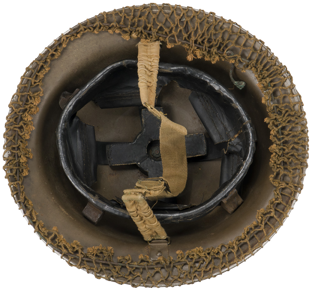 PHYSICAL DESCRIPTION: Constructed entirely of non magnetic steel, the basin shaped helmet, with an all around visor. Shell marked "RO & CO 1940". Nice complete liner (Size 6 3/4). Chinstrap complete. Complete with original netting.