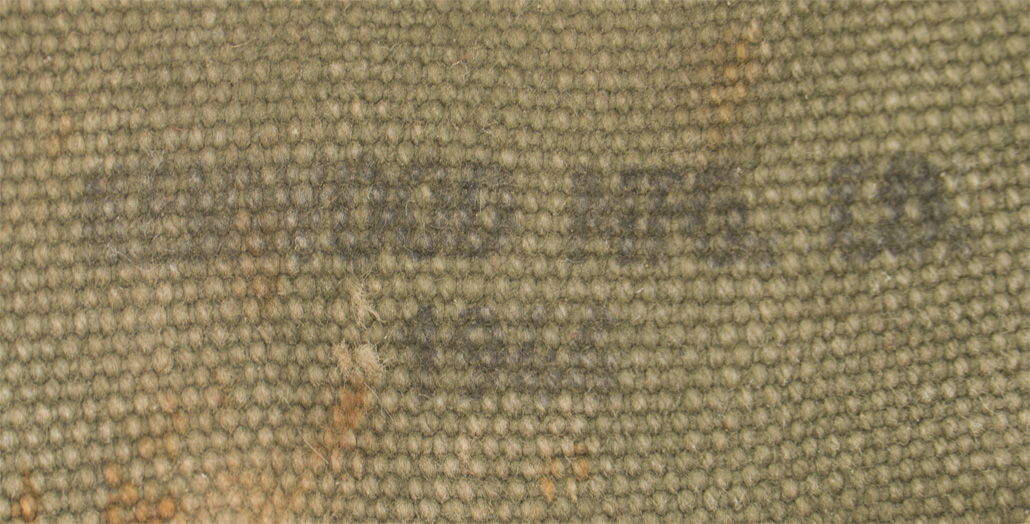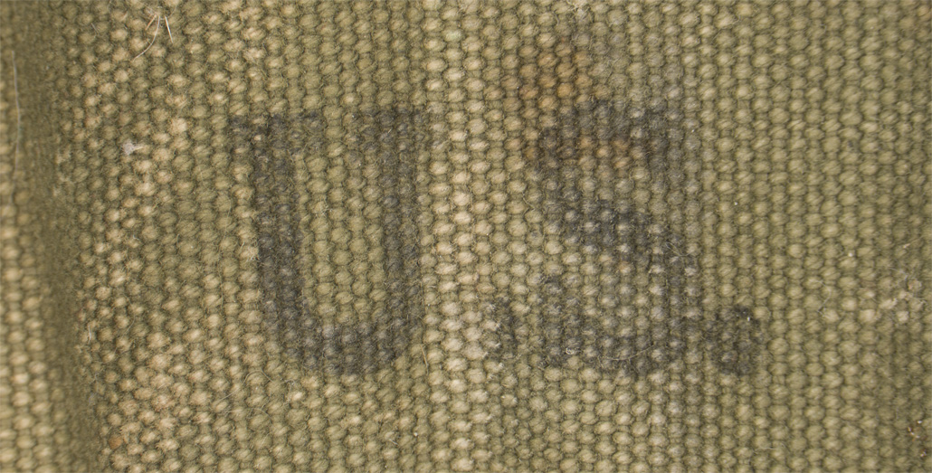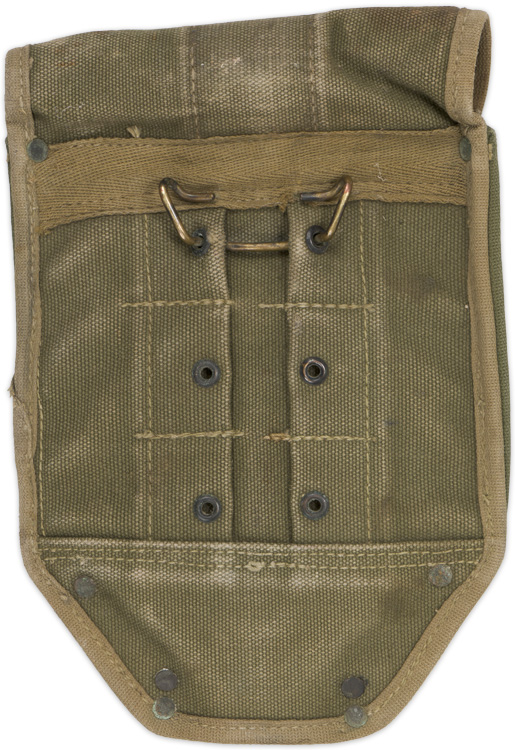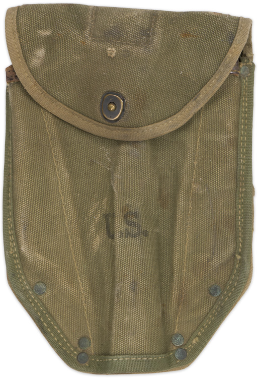 A two piece, sewn and rivetted, olive drab canvas folding shovel carrier. "U.S." is inkstamped to the front body of the carrier and a faint manufacture name and date is inkstamped to the interior of the fold over flap.