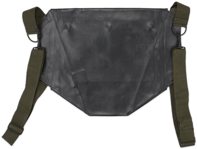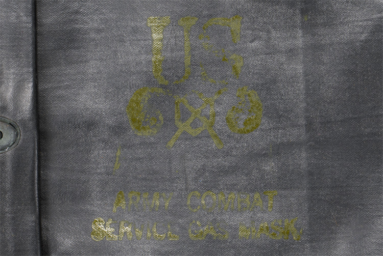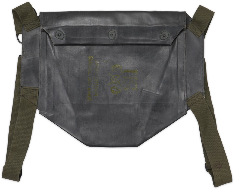 A 31cm wide x 41cm long rubberized bag with roll down top that attaches to three male snaps and webbed carrying strap. The front is clearly marked "Army Combat Service Gas Mask" with a chemical corps emblem.