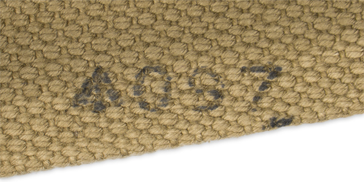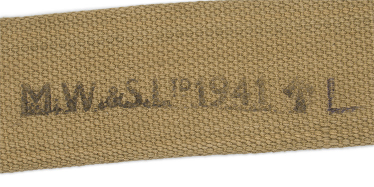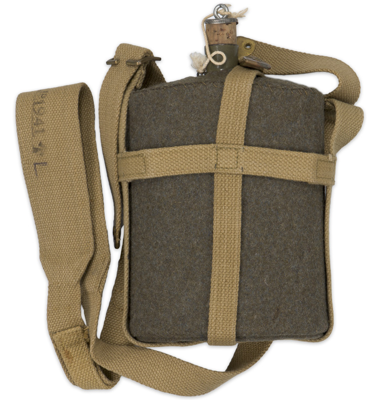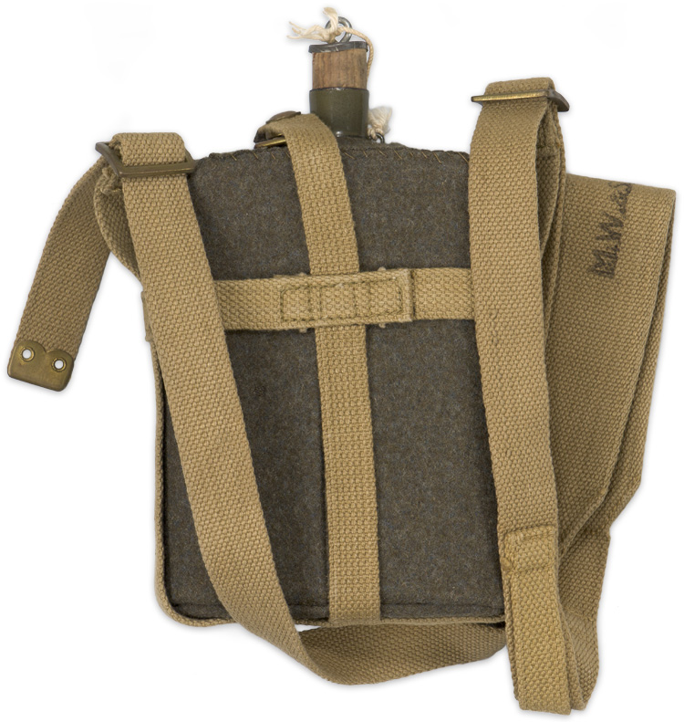 An olive drab enameled metal canteen with an olive drab wool cover and khaki colored webbed canvas harness. The canteen still has its original stopper cork, with an aluminum plate and metal eyelet to its top, through which a cord is attached its other end attached to a small, brazed metal loop at the base of the neck. Its wool covering has seams along its bottom and back, and is roughly sewn into place along the top edge of the canteen. The canvas harness is comprised of an encircling horizontal strap near the top, to which is stitched to a continuous strap which extends along the bottom and up each side, terminating in brown painted metal adjusting buckles. Another strap is stitched to the front center of the horizontal strap, where a brass stud is positioned, and passes underneath and up the back, where it extends and ends with a brass snap closure. This latter part of the strap passes over one side of the top of the canteen, its snap then mating with the forward stud. The webbed carrying strap is stamped “M.W. & S. Ltd. 1941" along with a broad arrow and an “L”.