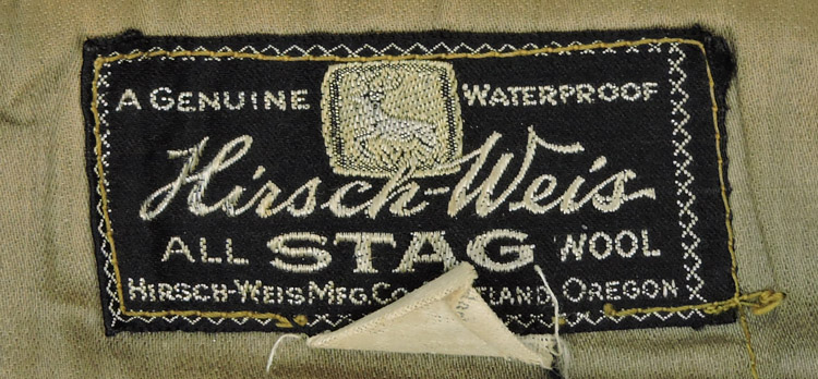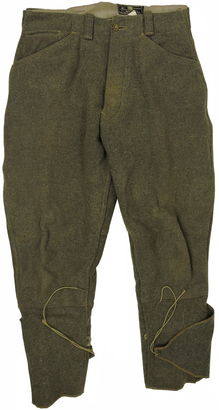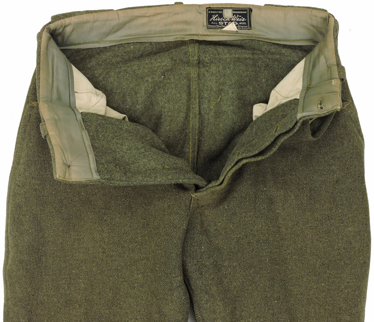 A pair of heavy, olive green wool breeches with a three button French fly, with an additional button to the waist. The breeches have a pair of diagonal slash hip pockets and a small slash watch pocket to the right, below the waistband. There are five cloth belt loops to the exterior of the trousers. The knee and seat area are double lines, with a couple of small repairs to the right leg. To the ends of each leg is a "wrap" of wool material with loops and corresponding laces. The interior bears the manufacture tag for "Hirsch-Weis Oil Stag Wool" (Portland Oregon) with a smaller tag showing the waist size as 31. The breech is 27".