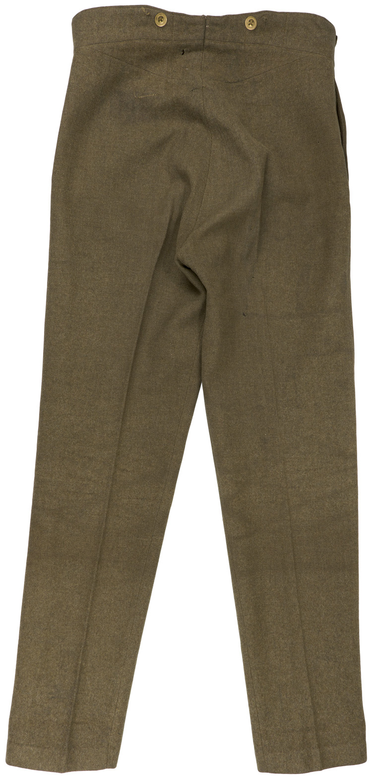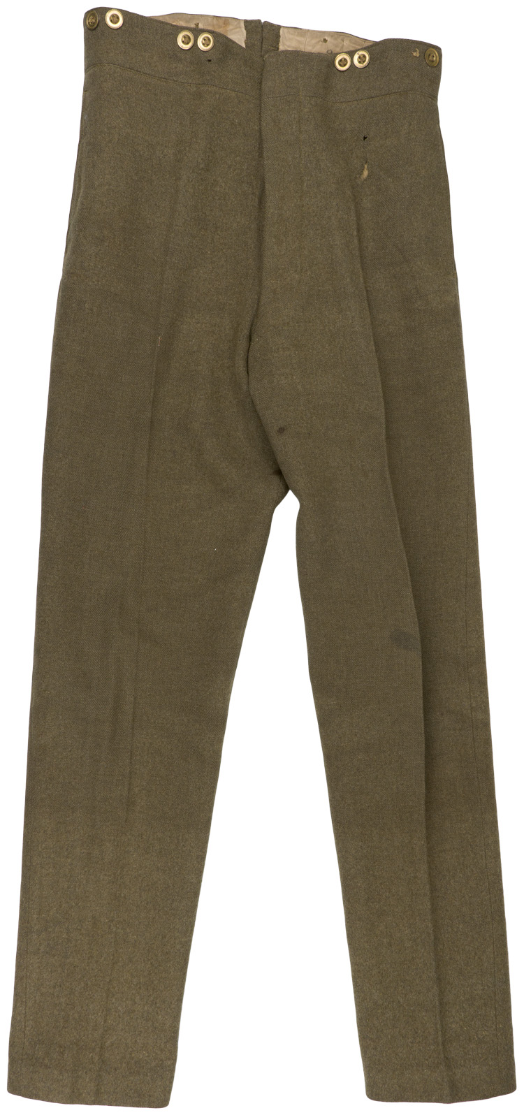 A pair of straight leg trousers with a five button fly with all buttons being replaced/mis-matched. A British Department war marking is stamped to the waist band. Nine matching, stamped alloy buttons extend around the waistband to allow for the attachment of suspenders. The waist measures approximately 32" with a 31.5cm inseam. The wool shows typical wear with a hole/tear to the front, as well as some light mothing.