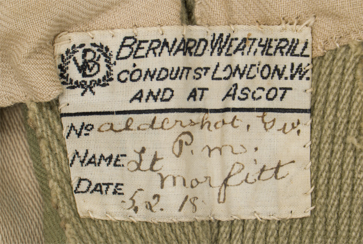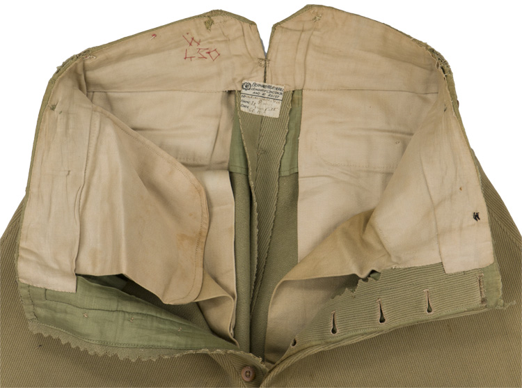 A pair of drab/olive green, cord and un lined, wool semi breeches tapered from the knee. They have a five button French fly, with a fifth button at the waist missing. The waist has hand embroidered initials sewn to it. A manufacture tag for “Bernard Weatherill of London” is also present that bears handwritten details such as the owners name and a date of “5.2.18". Two diagonal slash pockets are present to the front with a fob pocket below the waist. Five belt loops encircle the waist. All the buttons appear to have their original stitching. Five of the original matching buttons extend around the waist band for the attachment of suspender. Three buttons and eight reinforced eyelets with cord are present to each cuff. The waist measures approximately 29" with an inseam of 27". There is some light staining to the fabric, but otherwlise a very nice set of breeches.