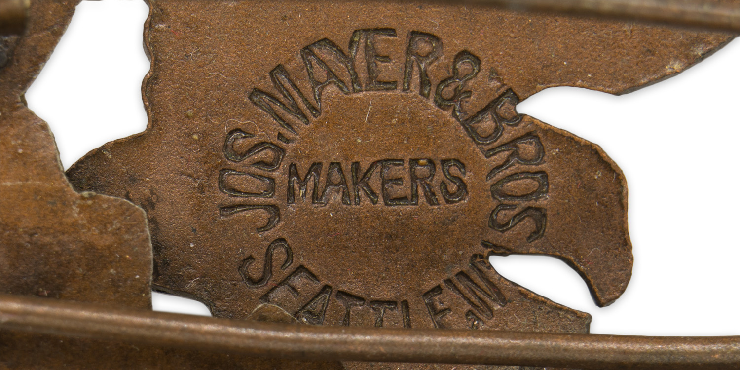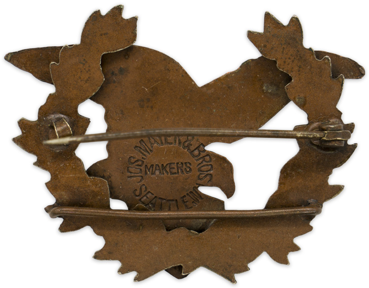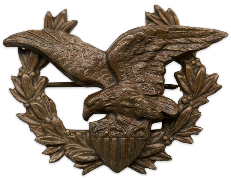 An eagle within a laurel wreath and the shield of victory with simple hinge pin and ribbon suspension loop. To the reverse of the eagle is a manufacture mark.