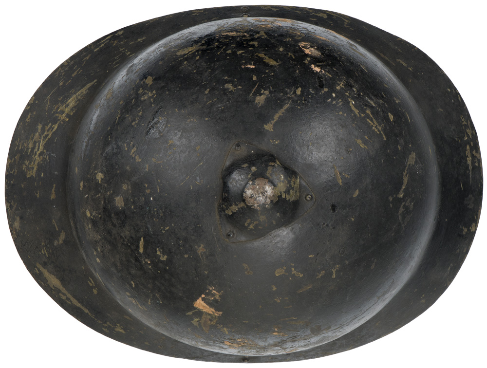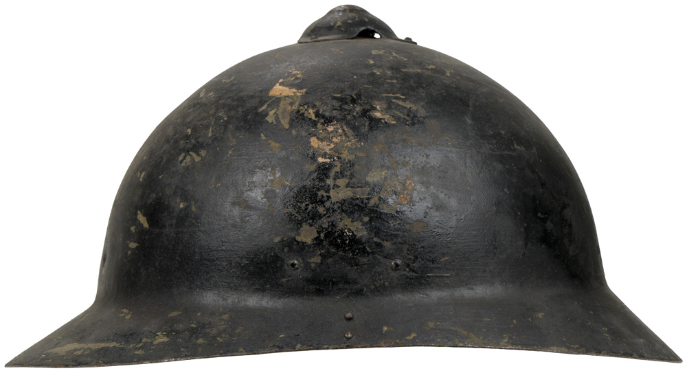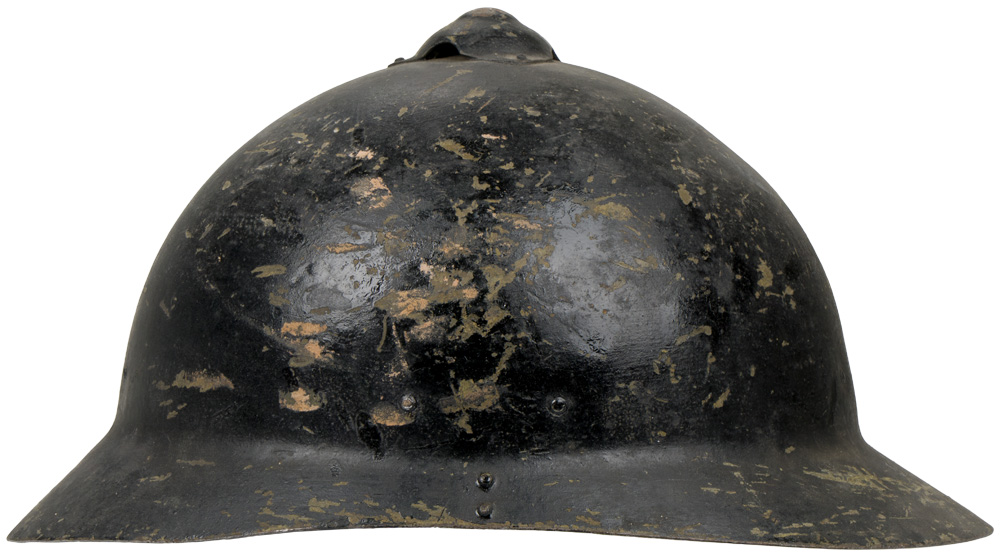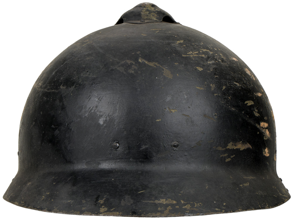 Finnish/Russian M17 helmet known as the "Sohlberg" helmet. The helmet is Russian design that was manufactured by Finland, which at the time was part of the Russian Empire. The M17 was produced at the Sohlberg and Holmberg factories in Helsinki in 1917, and were intended for shipment to Russia for installation of liners and issue to Russian Troops. The Finnish Revolution of 1917 stalled production of these helmets, and when Finland became an independent State the helmets were incorporated into the new Finnish Army. Those completed in Finland had fine reindeer skin liners, which were much softer than the Russian issue liners. The life of the Sohlberg helmet as a frontline combat helmet was unfortunately short lived, as after Civil War broke out in 1918 the 500 or so remaining helmets in the Finns possession were taken by Communist Red Guards before again being liberated by the pro Conservative "White" Guard victors. The helmets were issued to the Helsinki Regiment, before being withdrawn in 1920 and were then passed into service with Fire, and Civil Defense units. The Russian's also produced M17's but were slightly different than those produced in Finland. The most telling indication of Russian manufacture was that the top vent cap, and the Russian made M17 was also slightly larger. This example is in excellent condition, and has almost all of the original black paint applied by the Finnish Civil Defense. The original issue color of these helmets was green, but during WWII and the "Winter War" these were put back into service as Civil Guard/Civil defense helmets. Nice complete liner and chinstrap in excellent condition. Good large size, at least a 60. Scarce helmet.
