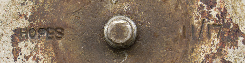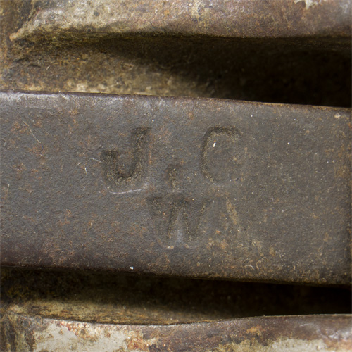PHYSICAL DESCRIPTION: The egg shaped grenade, roughly 10cm tall and with a circumference of 19cm at its widest point, is of serrated cast iron with a detachable striker lever, fixed in place by a horizontal pin. The lever is held in place by a brass cotter pin with a steel ring, with a brazed joint, through the pin eye and is engraved with "J.G.W.” (James Gibbons Wolverhampton). A screw hole, with a slotted plug, is opposite the pin to the top allows access to the interior cavity surrounding the striker and detonator, where the charge would normally be. A 63mm diameter gas check plate is screwed to the bottom. When removed it reveals the striker and spring.