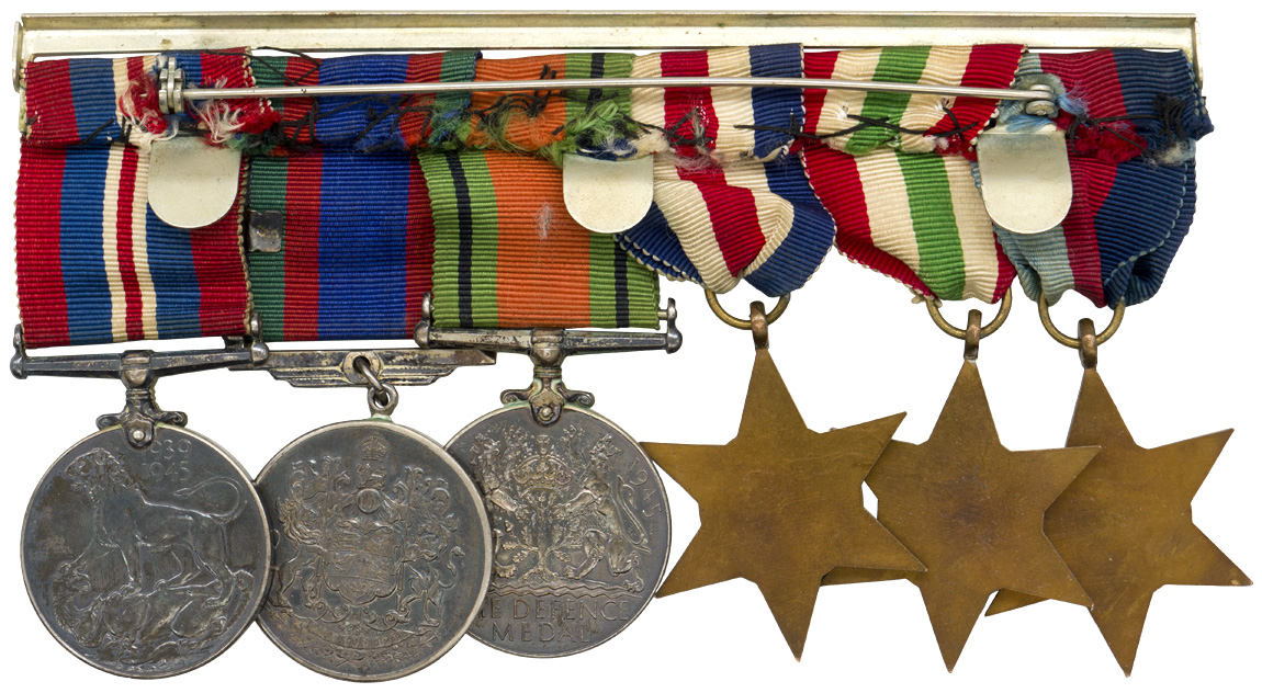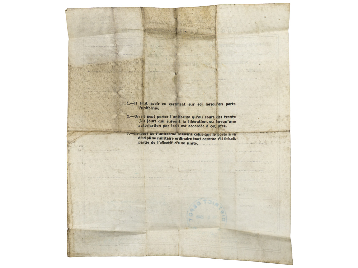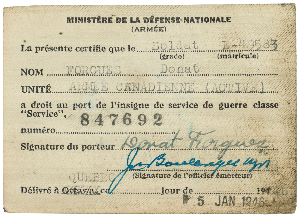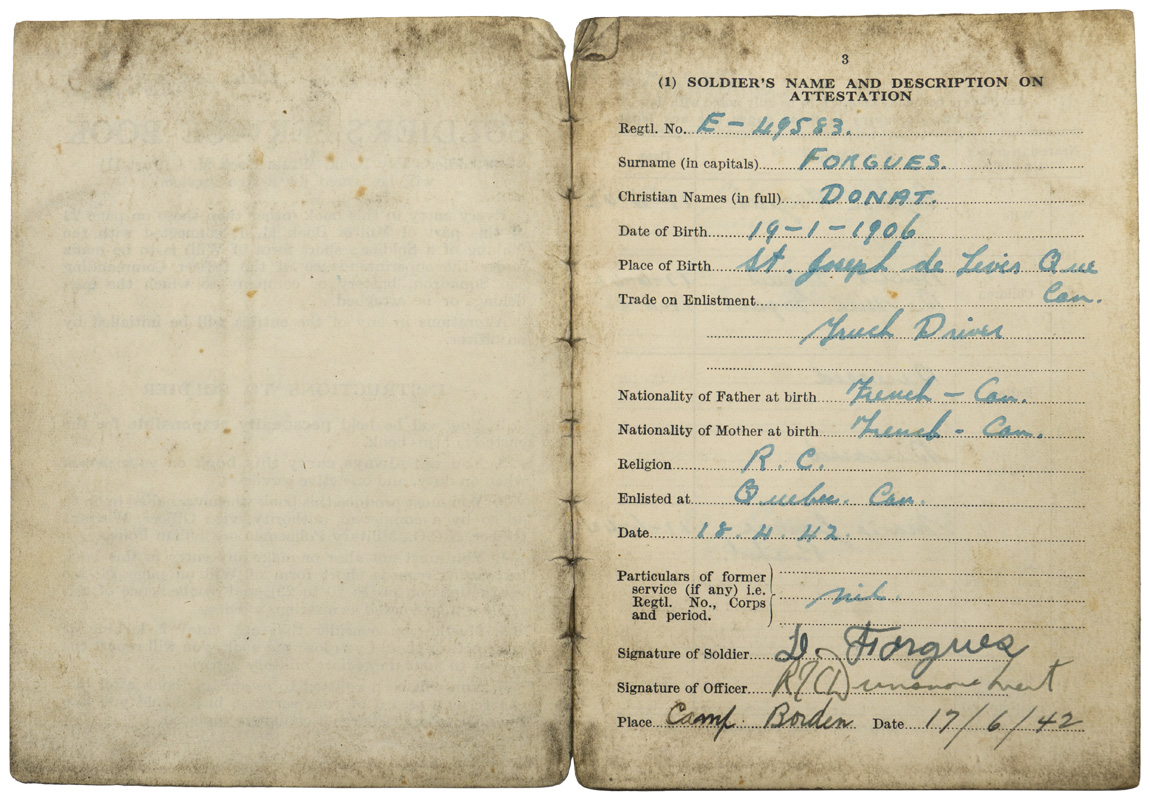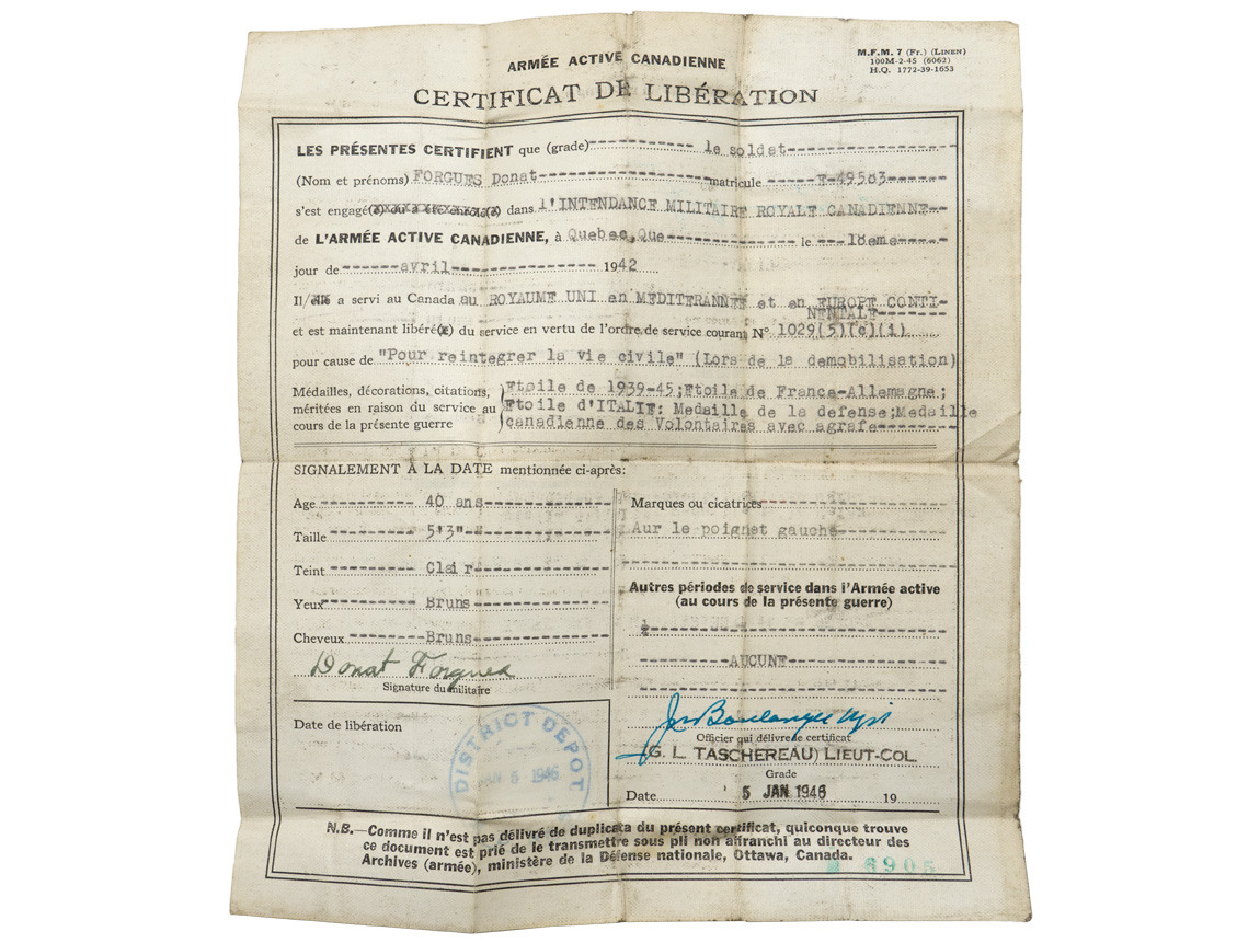 A very used and fragile service book for “FORGUES, Donat”, his “Certificat de Libération”, his six place medal bar and “No. 20 Works Coy RCE Camp Valcartier, Que” pin. The book, named to Mr. Forgues bears three black and white photographs. His certificate of release lists the medals awarded to him which match the medal bar; The 1939-1945 Star, The Ital Star, The France & Germany Star, the 1939-1945 Defense Medal, Volunteer Service Medal with bar and the 1939-1945 War Medal. A grouping worth of further research.