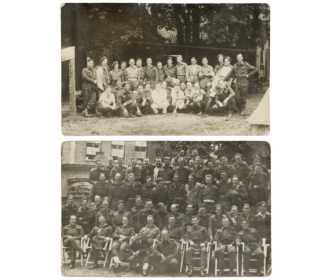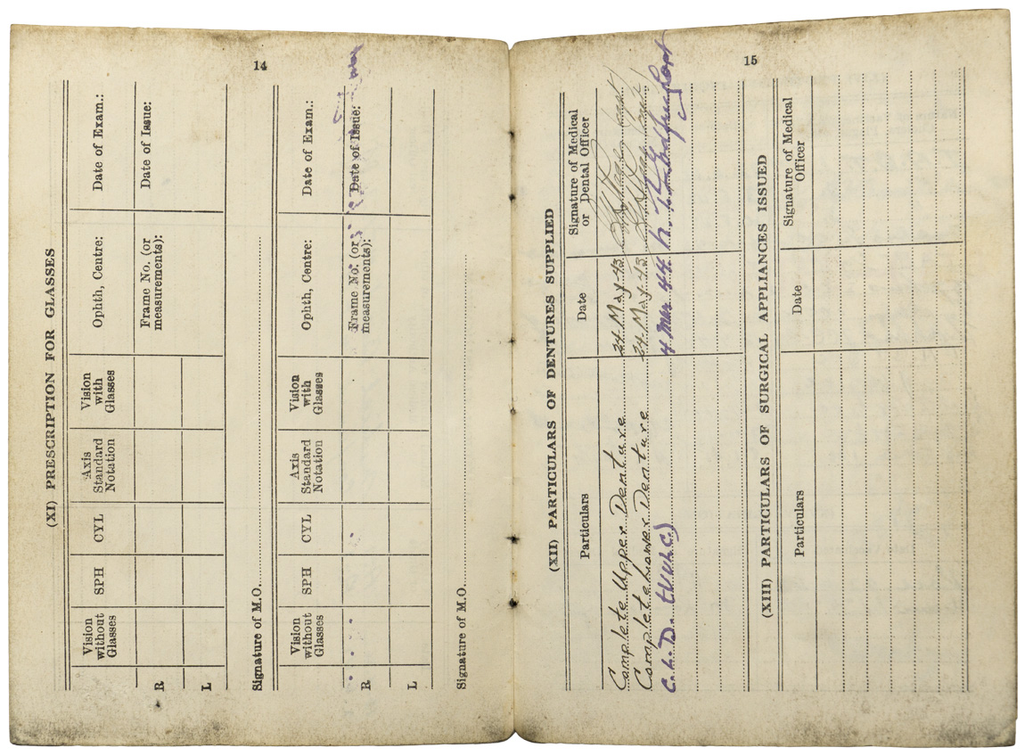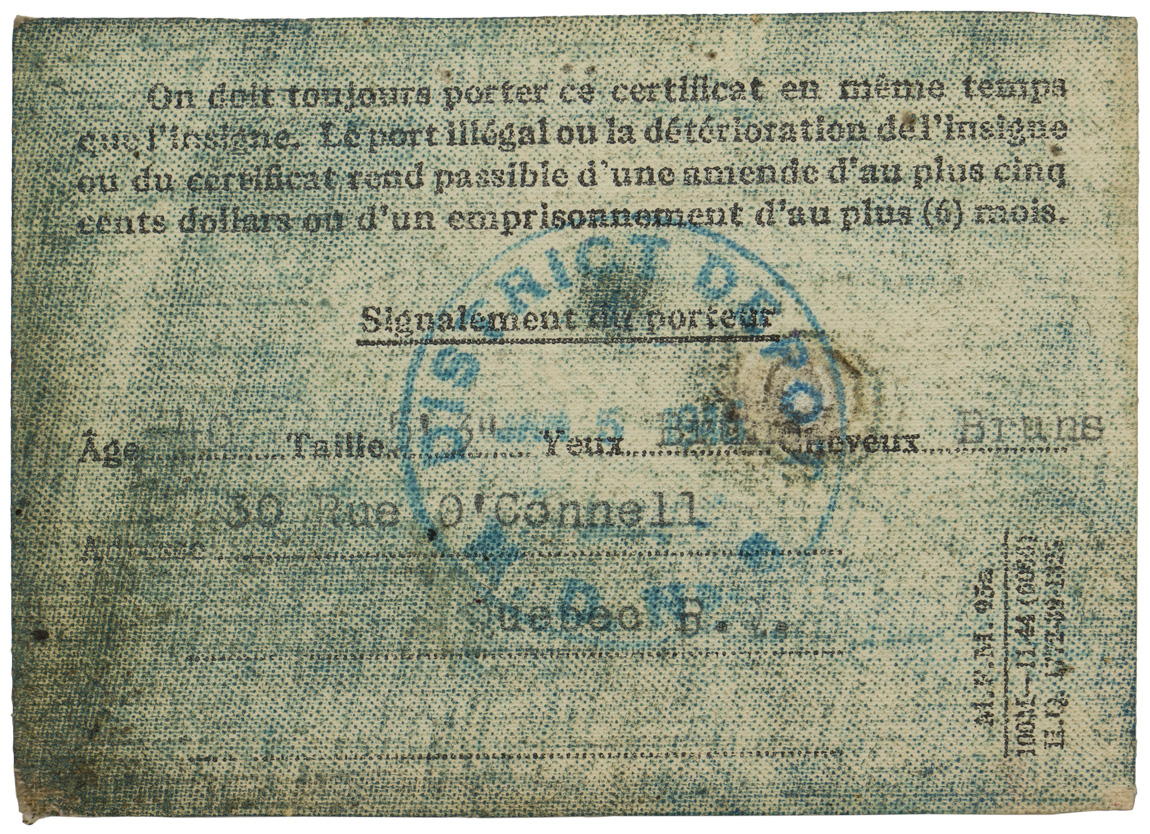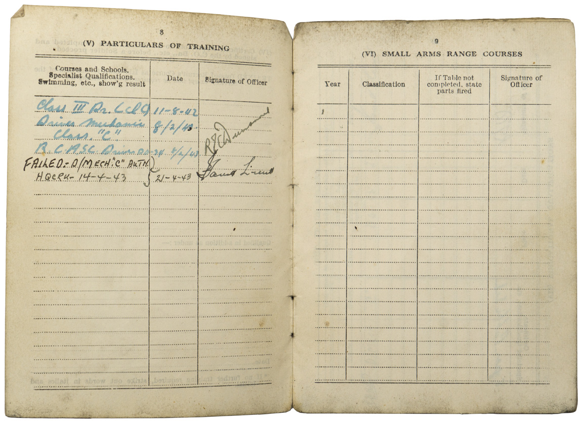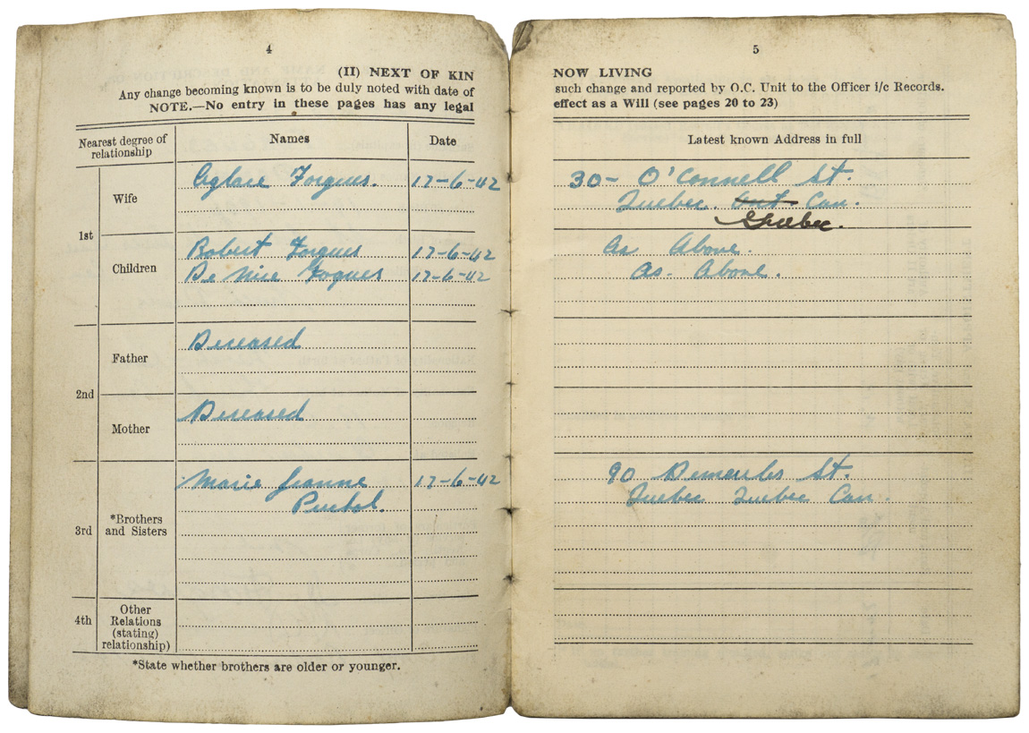 A very used and fragile service book for “FORGUES, Donat”, his “Certificat de Libération”, his six place medal bar and “No. 20 Works Coy RCE Camp Valcartier, Que” pin. The book, named to Mr. Forgues bears three black and white photographs. His certificate of release lists the medals awarded to him which match the medal bar; The 1939-1945 Star, The Ital Star, The France & Germany Star, the 1939-1945 Defense Medal, Volunteer Service Medal with bar and the 1939-1945 War Medal. A grouping worth of further research.