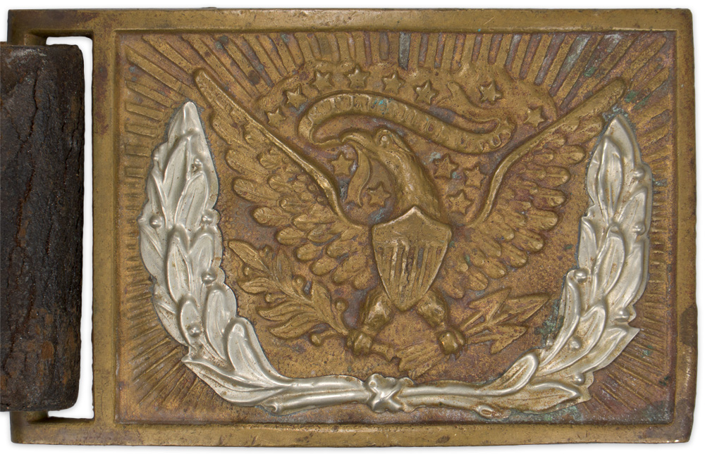 Civil War NCO's belt buckle. Cast brass eagle buckle with silver wreath. Total width is 54mm. Complete with original keeper and leather belt. Comes with an M1855 cartridge box and cap pouch. One of the straps on the back of the cap pouch has pulled loose and will need to be fixed, but otherwise a decent set. Nice worn and used example showing the expected age and wear.
