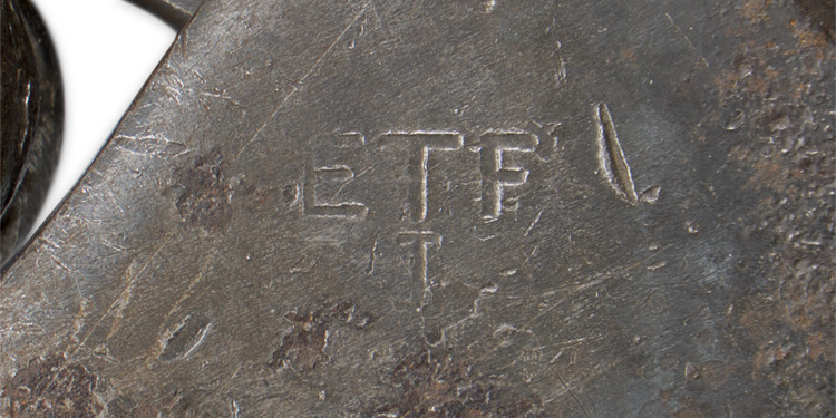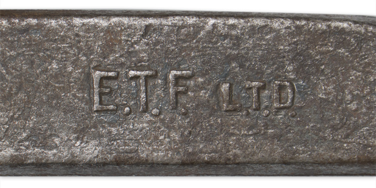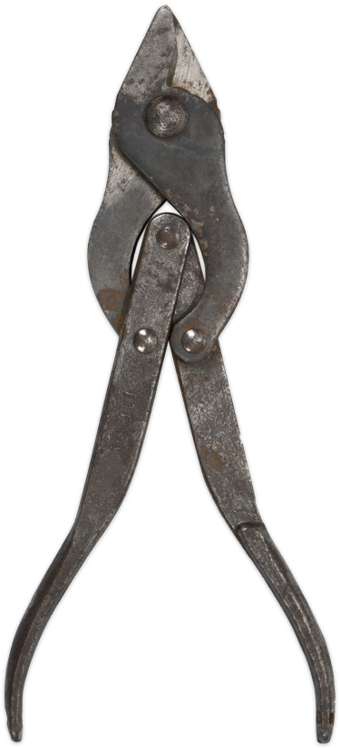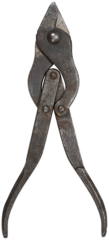 The metal cutters open to their full 33.5cm length when the handles are pulled apart. The manufacture name is embossed to one arm, “EFT Ltd.” The metal shows pitting and have been sharpened at one point.