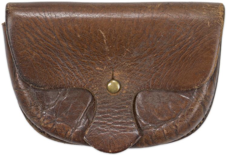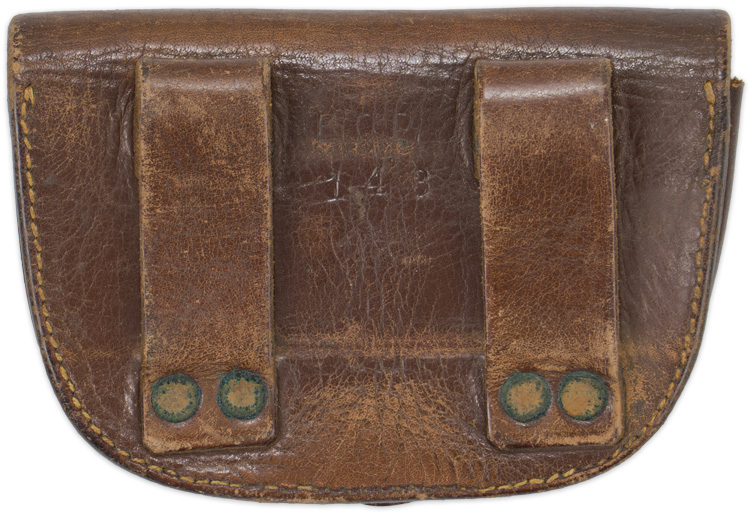 A brown leather, 14cm x 9.5cm ammunition pouch with a pair of rivetted belt attachment loops to the reverse, single flap with brass stud. The pouch is embossed to the reverse panel “B.C.P. 143" along with a broad arrow. Very good strong leather that remains supple.