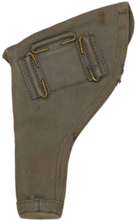 A standard RCAF issue blue-grey web holster for pistol or revolver with brass fittings. The canvas holster is about 32cm tall and 18cm wide along its top, tapering to 6cm at its reinforced base. It has a fold over top flap with brass snap closure. The edges are reinforced with additional stitched on webbing. There is a metal drainage grommet to bottom. Sewn to the reverse is a piece of webbing about 11cm by 7cm folded over on three sides to create loops through which three brass belt hooks have been inserted. Stamped in black ink to the interior top flap is faint makers mark and "C broad arrow", indicating it was issued through the Canadian Quartermasters Office, as well as "Z.L.& T.Ltd 1942". The holster shows typical usage, wear and staining.
