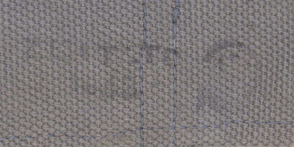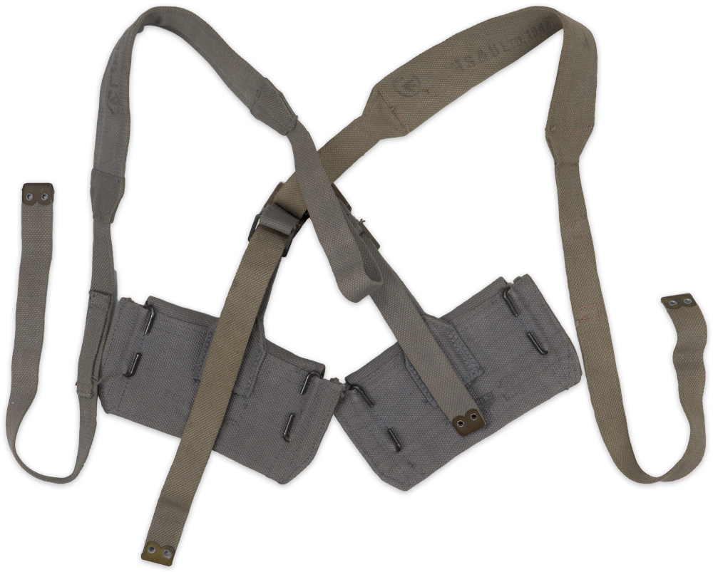 A pair of light blue grey webbed canvas, double pocket, ammo pouches with steel fittings and brass snaps attached to a pair of webbed shoulder strap.. Each pocket’s top fold over flap has a single brass snap closure which mates with one of two brass studs to each pouch front. To the reverse, on either side, are vertical painted steel belt hooks with, between them to the top, a vertical strap with a painted steel loop and another short strap with a painted steel buckle. A pair of standard RCAF, blue-grey webbed shoulder straps are attached that are stamped “M.S. & U Ltd. 1942" and “Z.L.& T. Ltd. 1943" along with a “C” broad arrow to each. They show typical usage and wear.