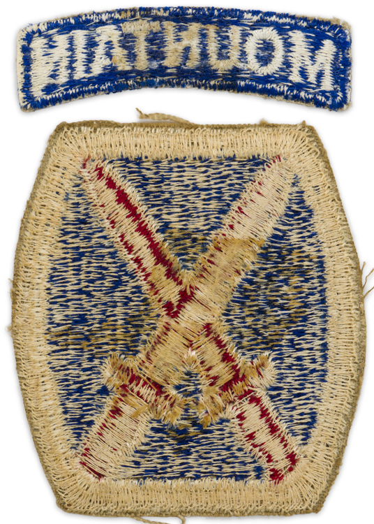 PHYSICAL DESCRIPTION: A machine embroidered 55mm x 64mm shoulder flash. White and blue background with cross bayonets in red. Compete with separate original "MOUNTAIN" flash.