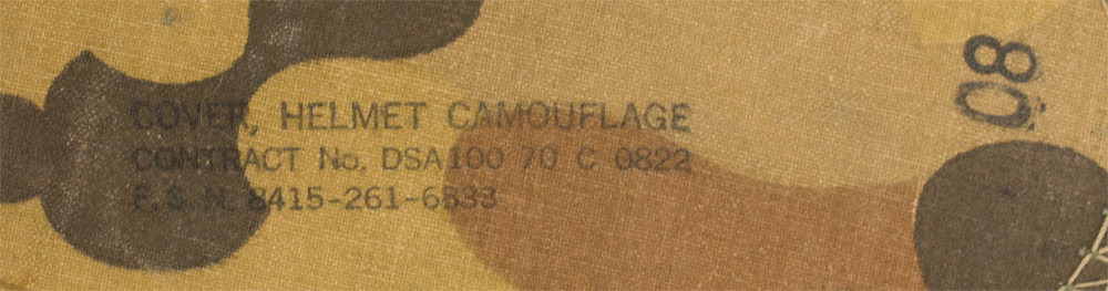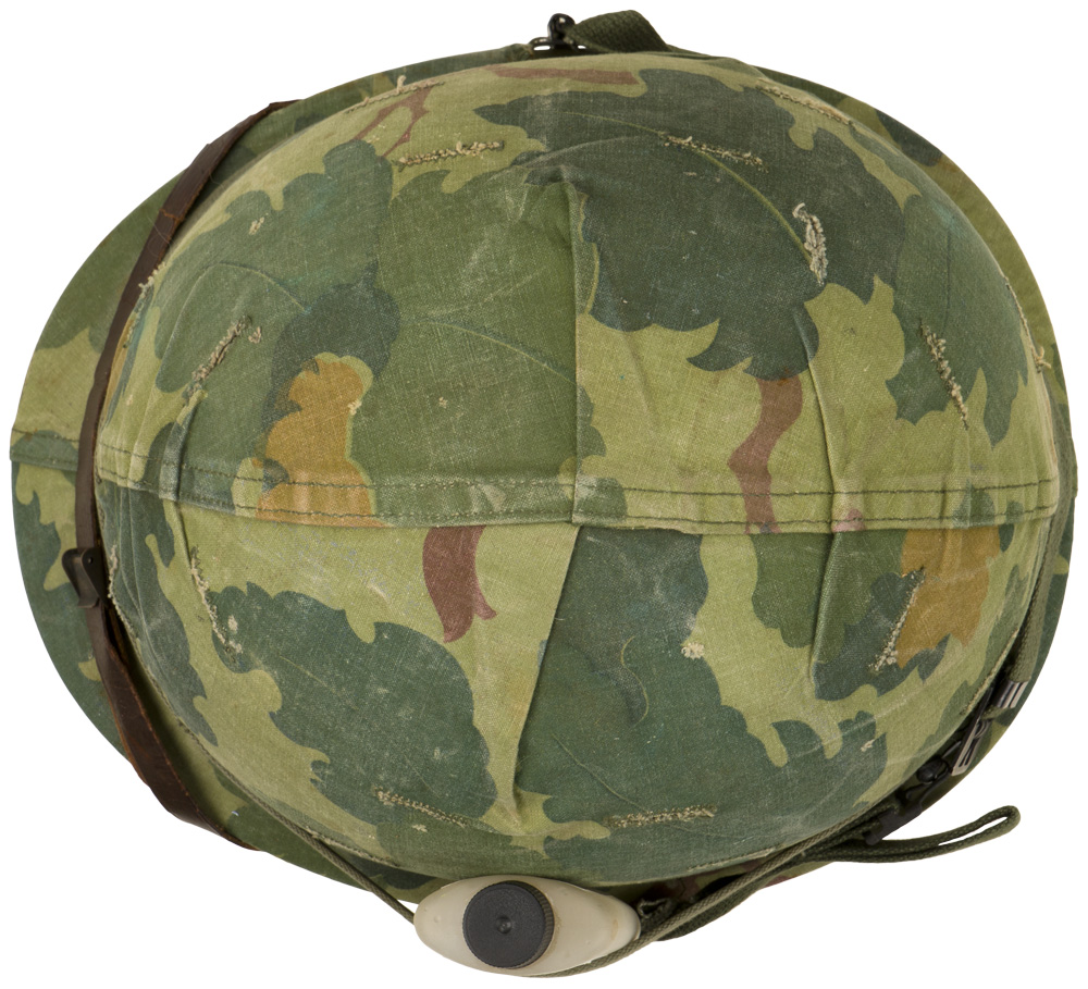 PHYSICAL DESCRIPTION: U.S. Vietnam War M-1 Helmet with Mitchell Camouflage Cover. Korean war era liner with 98 percent original paint. Mitchell cover is contract marked DSA 100-70-C-0822 indicating 1970 issue to the field. Original issue green elastic band holds cloth cover in place. Original brown leather liner chinstrap looped over the front brim of the helmet. With hard-to-find original issue "bug juice" bottle under the elastic camouflage bad as usually carried. Bottle still has a little of the original insect repellent in the bottle. Excellent complete untouched example of a midwar Vietnam M-1 helmet.