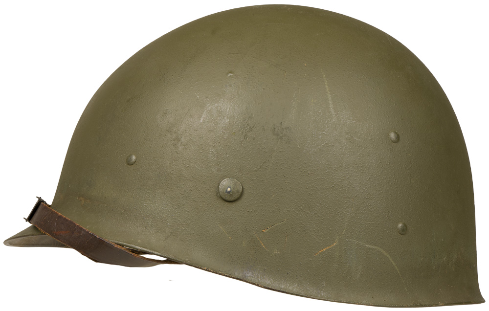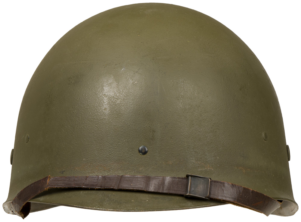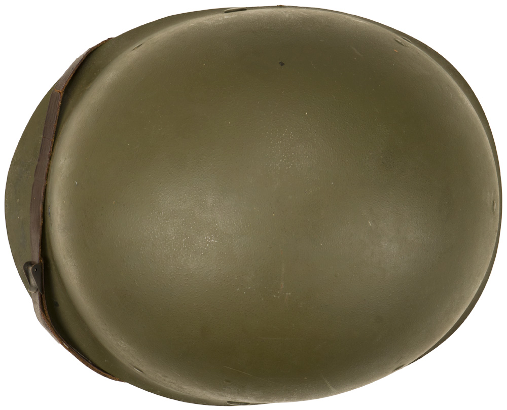 BACKGROUND: The M-1 helmet was developed as a replacement for the M-1917 helmet that had seen use since WW1. It was designed by using the crown of the M-1917, removing the brim and adding extensions to protect the neck, ears, and forehead. The resulting form was then used as a template for the production of a helmet body from a single piece of Hadfield Manganese Steel. The liner and suspension were developed after a modified Riddel Football helmet. The M-1 helmet was approved for production in June of 1941. Early models had solid loops (fixed bale) for the chin straps but they broke off to often and were replaced with a moveable hinged loop. The original rim of the helmet was made of stainless steel but it was found that the paint that was used would wear off to easily and leave a shiny reflective surface. To remedy this they switched to a Hadfield Manganese Steel and also changed the butt of the rim from the front to the rear of the helmet body. This change took place in October of 1944. The M-1 helmet had the best ballistic characteristics of any helmet developed up to then and could with stand the force from a 230 grain, .45 caliber bullet with a velocity of 800 feet per second.
