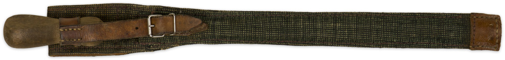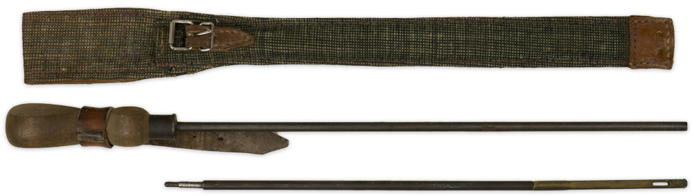 A herring bone twill pouch with leather reinforced end, as well as a leather retaining strap with roller buckle, that holds the wooden handle with a two section cleaning rod.