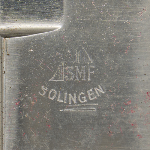 The replica knife features a roughly, 14cm long, non-fullered, blade with a long top swedge. The blade is "Soligen" and "41" marked. The knife has a small, integral, horizontally oval, steel cross guard and nicely contoured, carved, natural softwood grips. The grip are secured to the blade tang by two small, flat headed, steel rivets. The knife comes complete with a unpainted sheet metal scabbard with integral leather frog that has a "Waffen amt" stamped to it. The blade has been oiled.