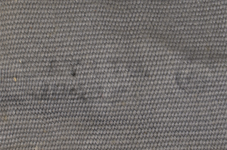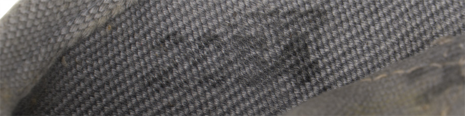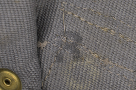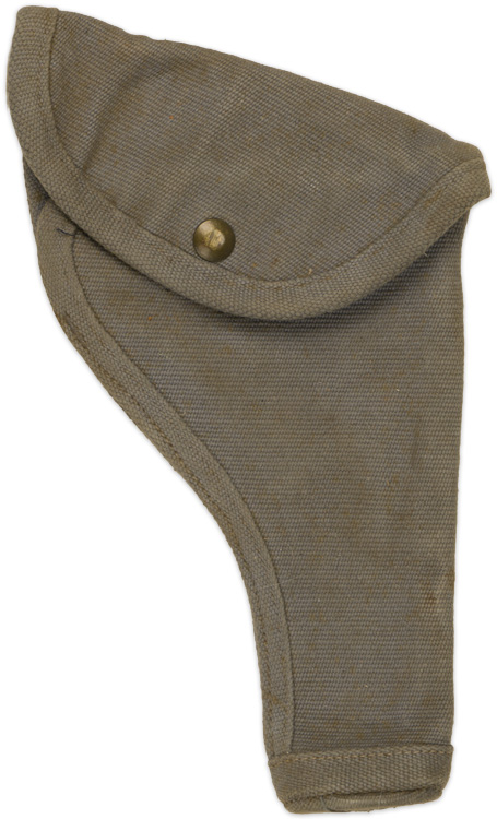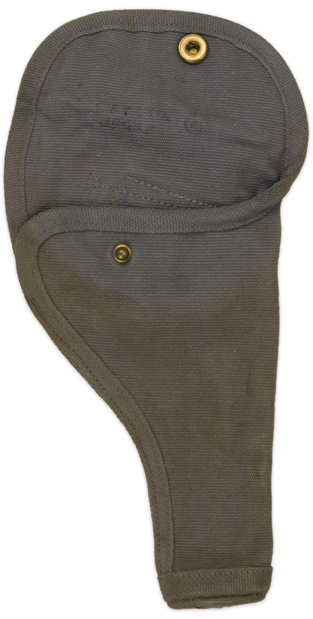 A standard RCAF issue blue-grey web holster for pistol or revolver with brass fittings. The canvas holster is about 30cm tall and 18cm wide along its top, tapering to 6cm at its reinforced base. It has a fold over top flap with brass snap closure. The edges are reinforced with additional stitched on webbing. There is a metal drainage grommet to bottom. Sewn to the reverse is a piece of webbing about 10.5cm by 7cm folded over on three sides to create loops through which three brass belt hooks have been inserted. Stamped in black ink to the interior top flap is faint makers mark and "C broad arrow", indicating it was issued through the Canadian Quartermasters Office. The holster shows typical usage, wear and staining.