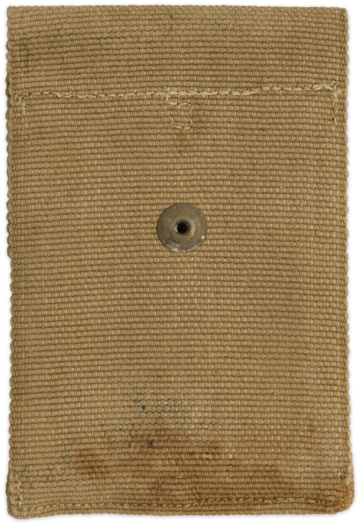 This pouch was designed to carry the magazines for the M1911 Colt pistol. It is divided into two vertical stacked pockets each with the posts for the "lift the dot" snaps attached. Each pocket is approximately 15cm in length by 5cm in width. There is a snap to the reverse on the belt loop that allows the pouch to be fitted to the pistol or mounted belts. Stamped to the inside flap "Oct. 1918" as well as being "Mills" marked.