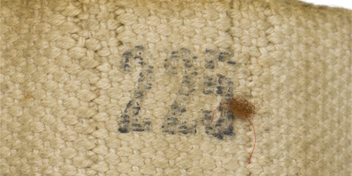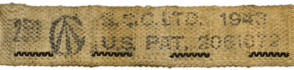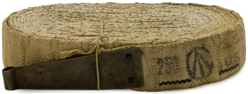 A 1943 dated cloth belt for use in M1917A1, M1919A4, and M1919A6 .30 caliber machine guns. The belt is manufacture marked and “C” broad arrow marked. Original cord still in place. Unused.