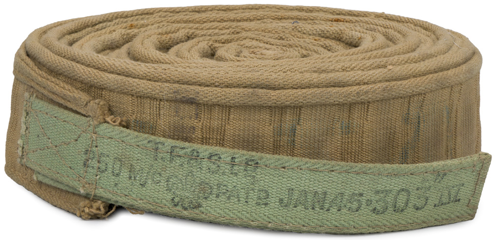 A cloth belt that is marked and dated for "JAN. 45" and ".303 IV".
