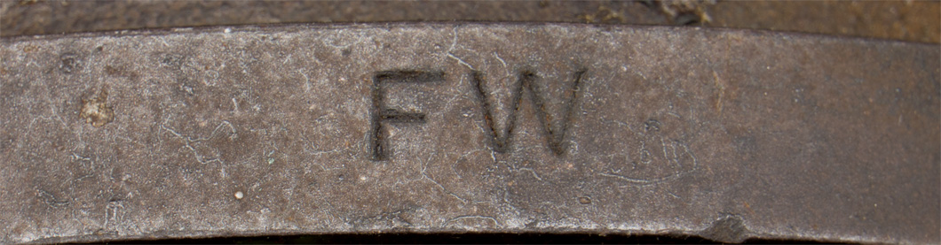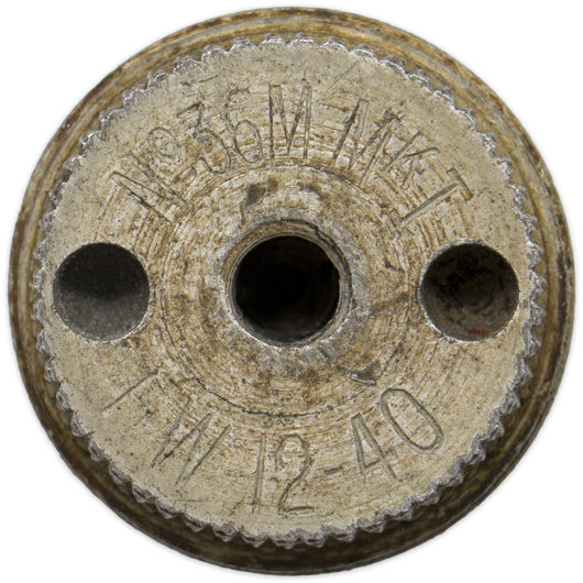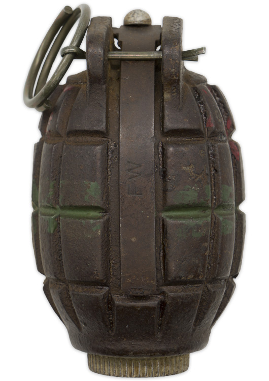 PHYSICAL DESCRIPTION: The egg shaped grenade, roughly 10cm tall and with a circumference of 19cm at its widest point, is of serrated cast iron with a detachable striker lever, fixed in place by a horizontal pin. The grenade was lacquered and has the remnants of a band of red X’s which were the Commonwealth markings for a grenade that was filled and sealed for use in tropical (moist) climates. There are remnants of green paint that indicate Baratol 80/20 filling. The lever is held in place by a brass cotter pin with a steel ring, with a brazed joint, through the pin eye and is engraved with "FW"(Frost & Woods). A screw hole, with a slotted plug, is opposite the pin to the top allows access to the interior cavity surrounding the striker and detonator, where the charge would normally be. Stamped to the body of the grenade is "FW" (Frost & Woods). To the bottom of the grenade is a 3cm diameter plug that is marked "No. 36, Mk1" and “FW 12 40" .