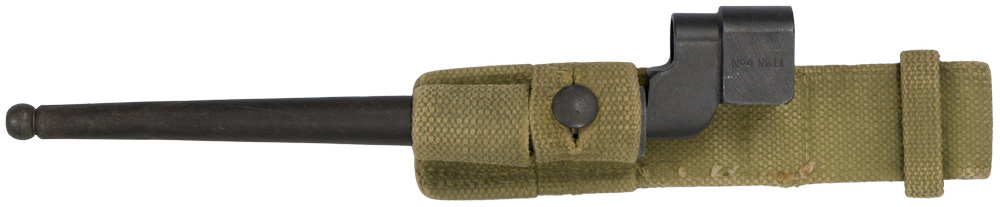 PHYSICAL DESCRIPTION: The bayonet is the form of an 20cm or 8" spike, tapered at its point, which widens and proceeds to one side at its other end where a circular muzzle socket and spring release catch may be seen. The "No 4 MK I" blued metal scabbard is in the form of a tapering tube, 21cm or 8 1/4" long, with a ball tip and a circular frog lug is near its throat. The khaki colored webbed canvas bayonet frog in the form of a vertical strap folded back and stitched upon itself to form a belt loop.