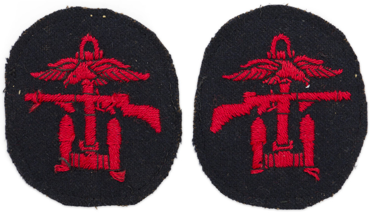 which consists of a "Tommy" gun, an eagle and a stockless anchor, which represents the Army, the Royal Air Force and the Royal Navy, machine embroidered in red on a black felt background. The reverse of the badges have a black cloth backing with glue remnants.