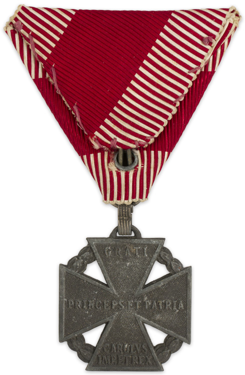 (Medalie)Instituted on December 13, 1916 by Emperor Karl I of Austria/Hungary and awarded for a minimum of twelve weeks of service, regardless of rank, that had served at the front. There were 651,000 awarded. The pateé cross with laurel wreath, is marked to the front with an Austrian and Hungarian crown above the letter "C" (Carolus), along with the words "Vitam Et Sangvinem" (With Life and Blood) and date MDCCCXVI (1916). The opposite side has the words "Grati Princeps et Patria, Carolvs Im. Et. Rex" (A Grateful Prince and Country, Karl, Emperor and King). It is suspended by a ring on an alternate red and white striped silk ribbon. Of Note: This medal’s design is based on the the ‘Cannon Cross’ – ‘Kanonenkreuz’ of 1813-1814.