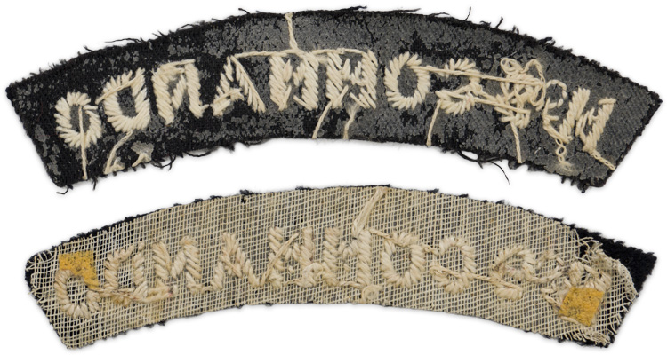 PHYSICAL DESCRIPTION: A pair of arch shaped, black wool flash, with the text "No 9 Commando" machine embroidered in white. They appear to have been removed from a uniform.