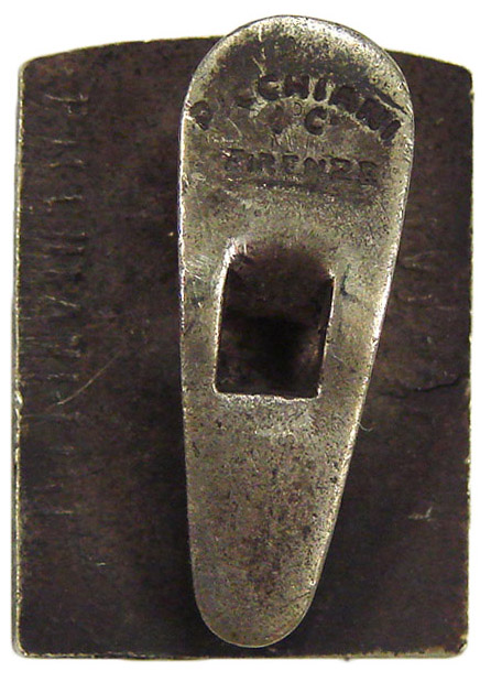 : The "Opera Nazionale Dopolavoro" or "Leisure and Recreational Organization" was originally formed in 1925 under the demands of the Fascists unions as a way to compete with the Socialists who had a network of cultural organizations. Originally, it was not affiliated with the Fascist Party and therefore gained support of employers, and was modeled after the YMCA. This changed in 1927 when it was taken over by Augusto Turati who turned the O.N.D. into an auxiliary of the party. In 1930, under Archelle Starace, the O.N.D. became primarily a Sports & Recreational organization of sports and other outings.PHYSICAL DESCRIPTION: A silver alloy , and enamel square shaped, lapel or button hole pin that has a silver frieze on a blue enamel sky (background) with a stylized "OND" to the top. The makers mark is to the reverse. The metal shows darkening, but otherwise, is in nice condition.