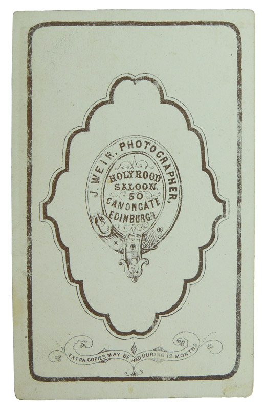 A heavy, 6.5cm x 10cm, sepia photograph. The reverse reads "J. Weir Photographer, Holyrood Saloon 50 Canongate, Edinburgh". Looks 1870/80's.