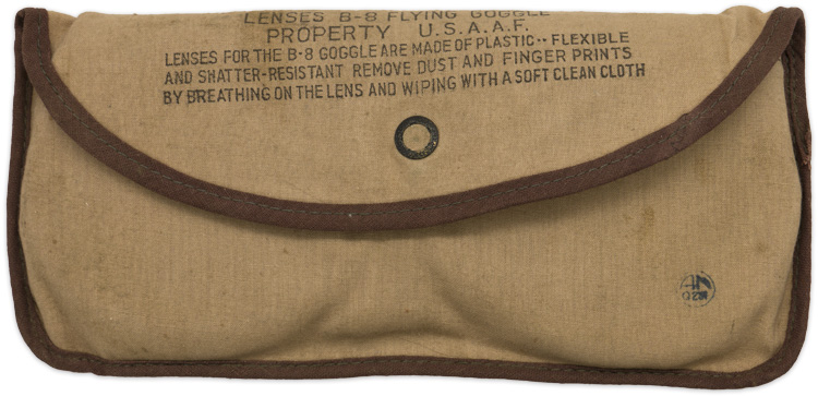 A cloth case with seven pairs of original extra lenses (four polaroid green, one polaroid amber and two polaroid clear). All are separated by paper cutouts resembling the lenses. To the outside flap, stamped in ink, is "Lenses B-8 Flying Goggle Property U.S.A.A.F." along with how to care and clean for the lenses. There is also a small circular stamp to the front. The lenses are in excellent condition with the case seeing moderate usage and aging. The cloth case measures approximately 21cm x 9cm.