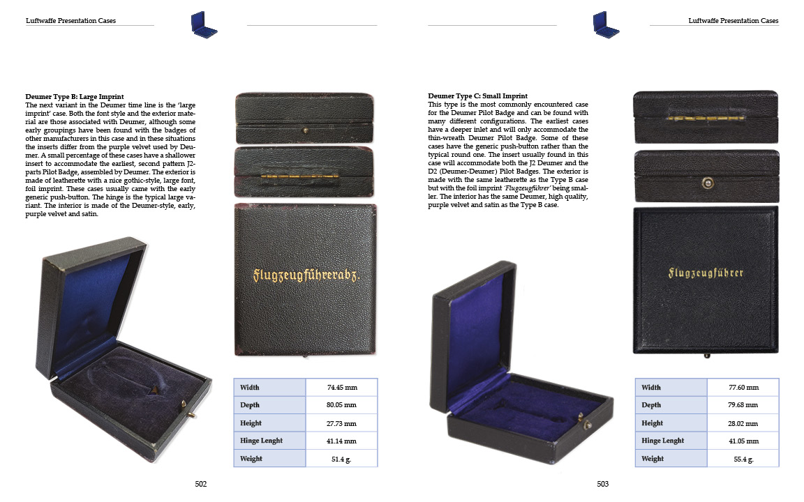 This is the most comprehensive and detailed book written about the German Luftwaffe Pilot and Combined Pilot and Observer Badges of WW2. Exhaustive research led to all variations to be presented. The result is a beautiful box set with two volumes and a total of 620 pages. All pictures are high quality and large enough to show every detail of an original. Pilot Badges are quite large and the book reflects this by its size of 8x10 inches, which allows for larger pictures, as well as more room for descriptive text. The contents of each volume are attached to provide you with what is included: Introduction of the Luftwaffe, training in the Luftwaffe, and award regulations. All Chapters begin with a full descriptive spreadsheet with all data and each variation is covered with high quality pictures. In depth study of all three types of the Pilot and Observer Badges with Diamonds. 52 award cases of the most common and rare examples, followed by all matching awards. The best cloth and bullion groups ever shown with in depth study. Awards certificates, miniatures, post-war Souval and S&L badges. Presentation of the most common and dangerous reproductions. Many pictures of the badges in wear. Both volumes are printed on quality paper and all come in a strong and rigid protective slip case.
