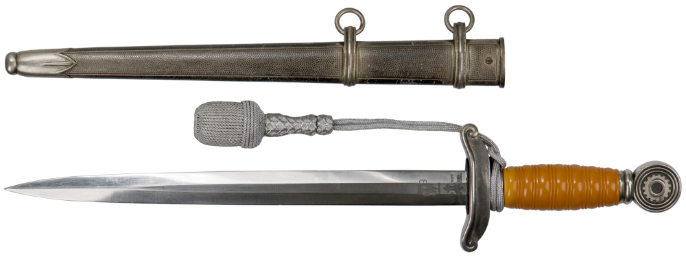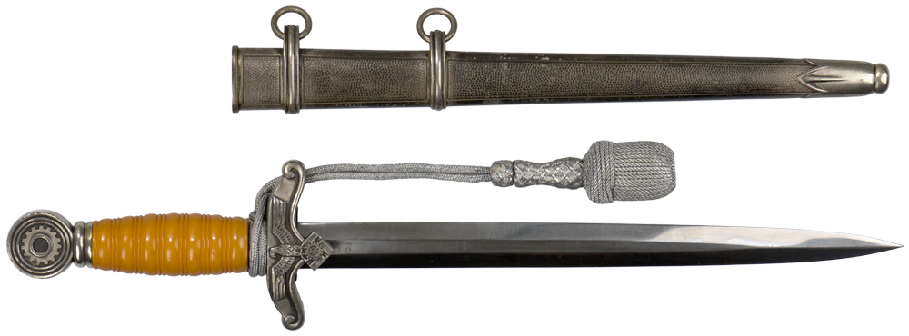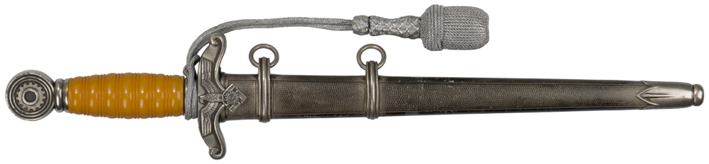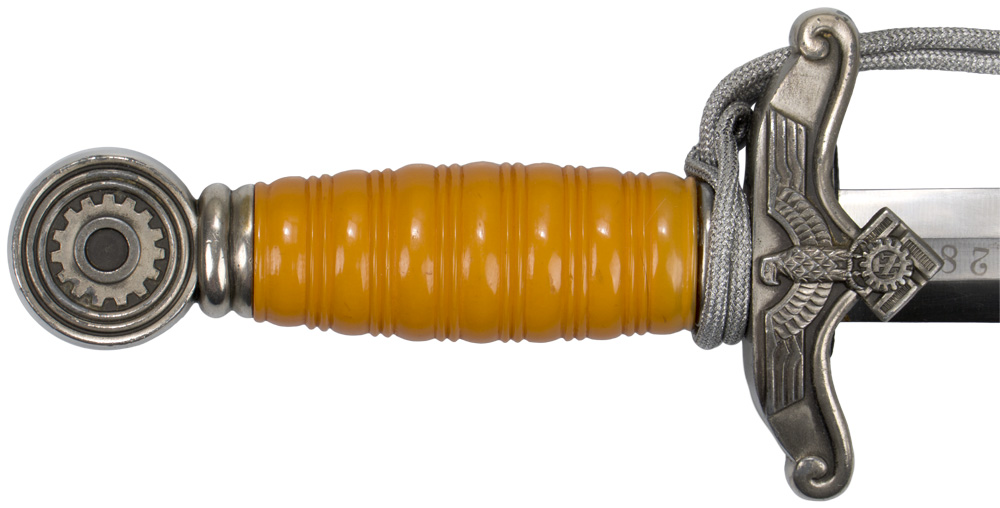 PHYSICAL DESCRIPTION: This TeNo Leaders dagger in excellent condition. The cross guard features the special eagle being a Paul Casberg design. The eagle is stylized, having open wings and clutching a double lined swastika having decorative lines in the legs and a superimposed gearwheel enclosing the letters "T N", with the "T" letter being in the shape of a mining hammer. The grip in yellow celluloid. The grip is in perfect condition. Wrapped about the grip is the original to the piece 23cms portepee. The scabbard is straight throughout. It has fine pebbling to the panels on both sides. The throat is retained by a single flatter head screw positioned in the center of the reverse upper scabbard. The throat is stamped with the number #2897. Excellent TeNo blade. The obverse ricasso of the blade is matching stamped (not etched), and the stamping runs vertically, toward the tip, as we see only on early examples. The matching stamping is "2897". The reverse ricasso is dark etched with the TeNo eagle grasping a swastika together with the gearwheel and "TN" initial. On either side of the TeNo eagle are the patent pending words, "Ges. Gesch". The original blade washer is present. Superb example.