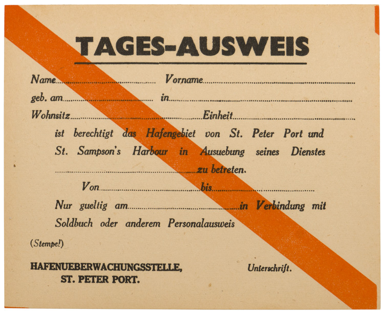 A 9.5cm x 11.5cm, single sided "Tages-Ausweis" or Day Pass from St. Peter Prot, Guernsey.