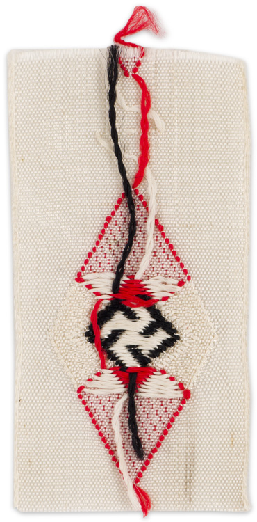 PHYSICAL DESCRIPTION: A woven rayon red-white-black HJ cap diamond. Roughly 27mm x 15mm. Mint & nice