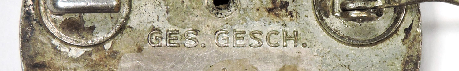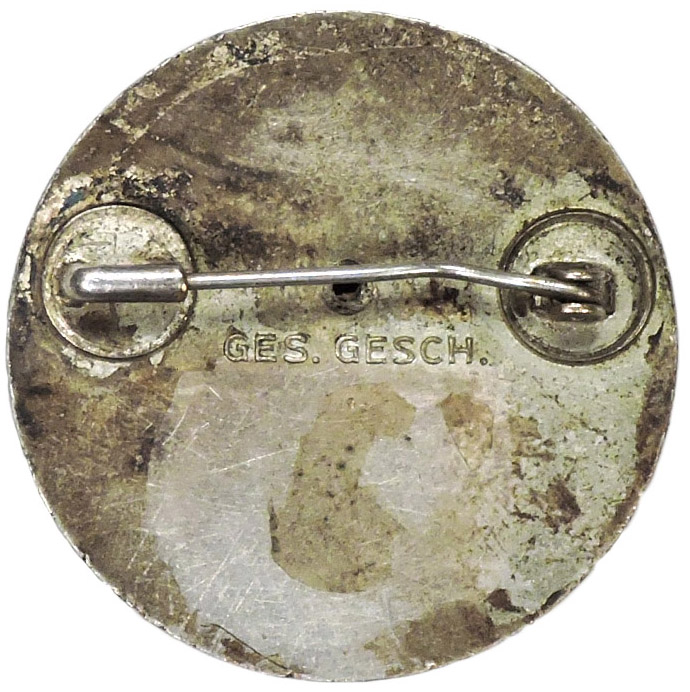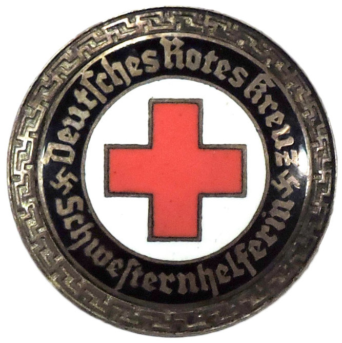PHYSICAL DESCRIPTION: Roughly, 36mm diameter, two piece, die struck alloy brooch with a black, white and red enamel work. The brooch features a circular outer border with an embossed, intertwined, repeating, stylized swastika pattern encompassing an inner black enamel border with silver washed Gothic script, "Deutsches Rotes Kreuz Schwesternhelferin", (German Red Cross Nurse's Helper), encompassing a white circular inner enamel field with a central red enamel Greek style cross. The central enameled section of the brooch is inset onto the alloy base. The solid reverse features embossed script, "Ges. Gesch"., indicating, Gesetzlich Geschützt, (Protected by Law). The reverse also has a small soldered hinge on a circular base plate, a thin round horizontal pin and a soldered catch on a circular base plate all intact.